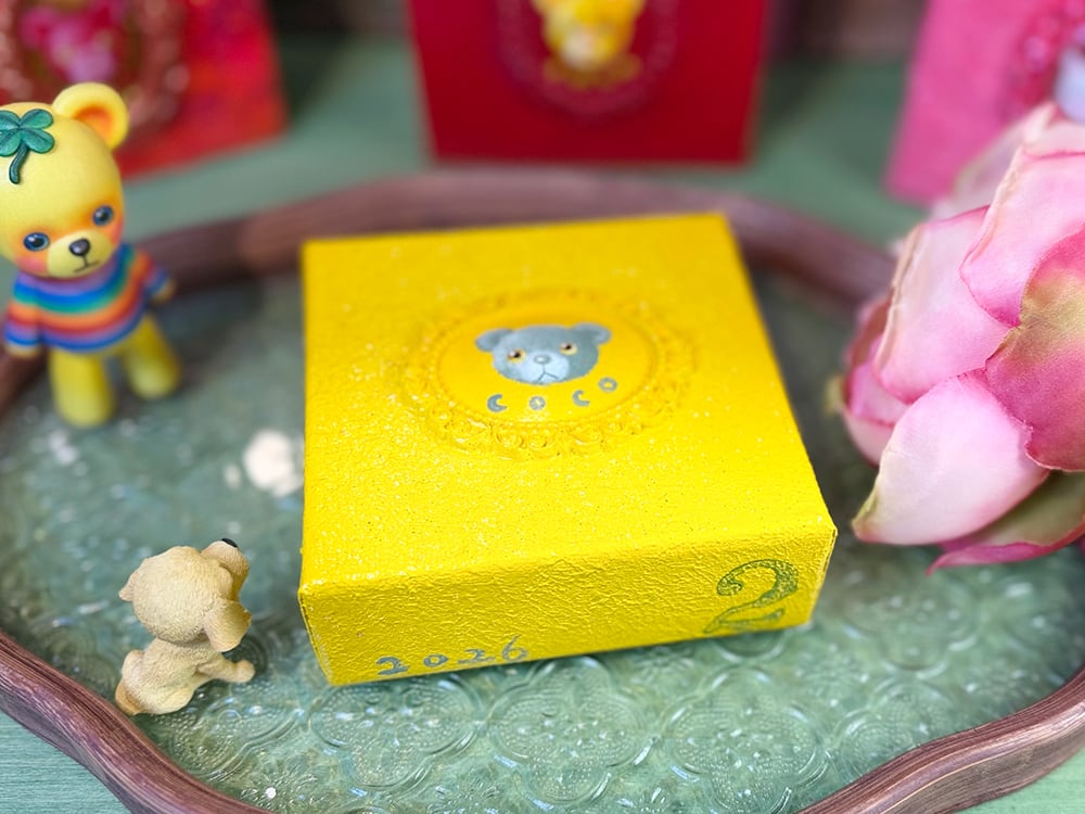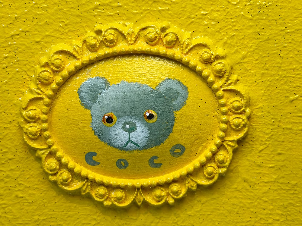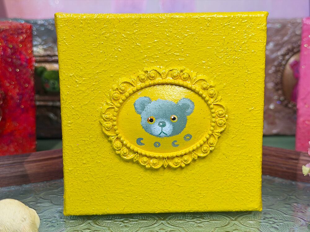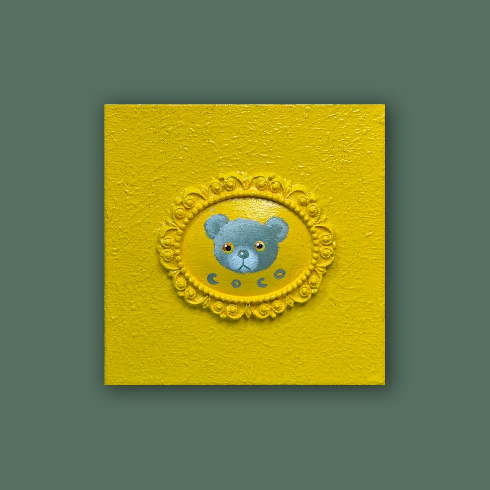 YouTube生ライブ配信で描いた作品です。独自配合した粘土で作ったアンティーク風のミニチュア額とキャンバスがイエロカラーで統一されており、そこに【モスグリーンのcocoくま】が描かれた作品。壁に飾るのはもちろん、厚みがあるのでキャビネットやコレクションケースに置いた状態で飾ることができる3Dキャンバスの作品です。