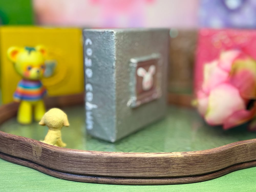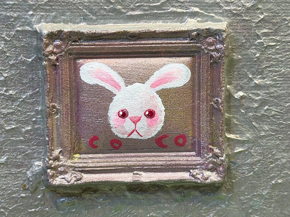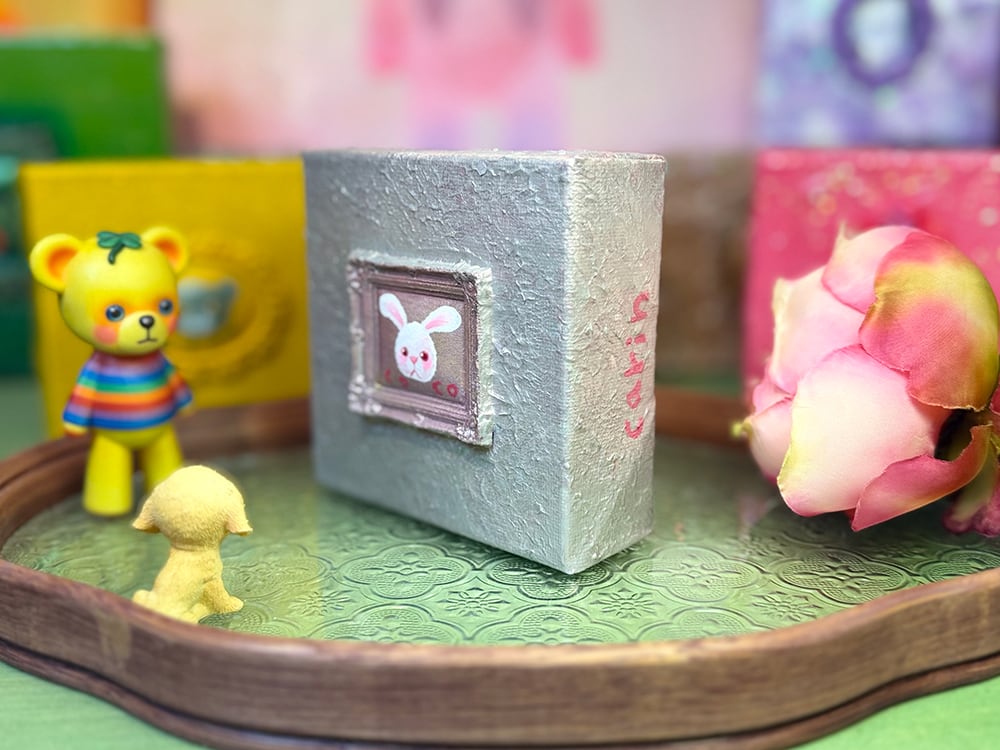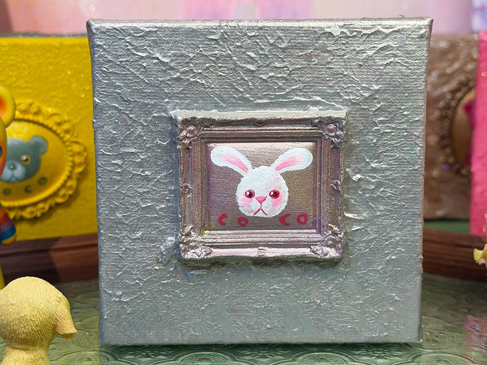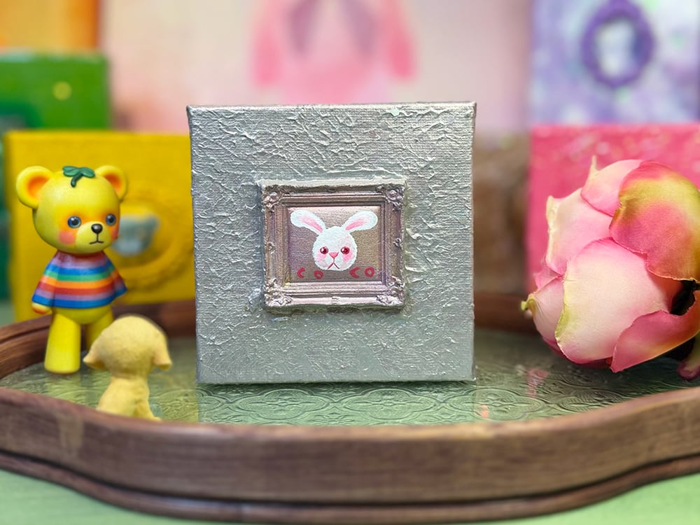 YouTube生ライブ配信で描いた作品です。独自配合した粘土で作ったアンティーク風のミニチュア額とシルバーのキャンバス、そこに【白いcocoミミ】が描かれた作品。壁に飾るのはもちろん、厚みがあるのでキャビネットやコレクションケースに置いた状態で飾ることができる3Dキャンバスの作品です。