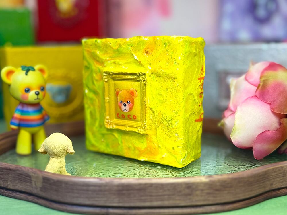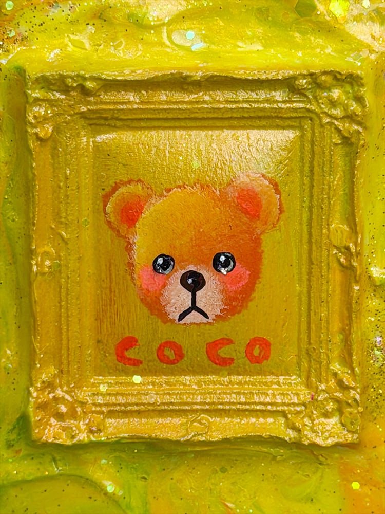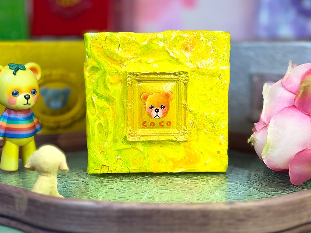 YouTube生ライブ配信で描いた作品です。独自配合した粘土で作ったアンティーク風のミニチュア額とキャンバスがイエロカラーで統一されており、そこに【オレンジのcocoくま】が描かれた作品。壁に飾るのはもちろん、厚みがあるのでキャビネットやコレクションケースに置いた状態で飾ることができる3Dキャンバスの作品です。