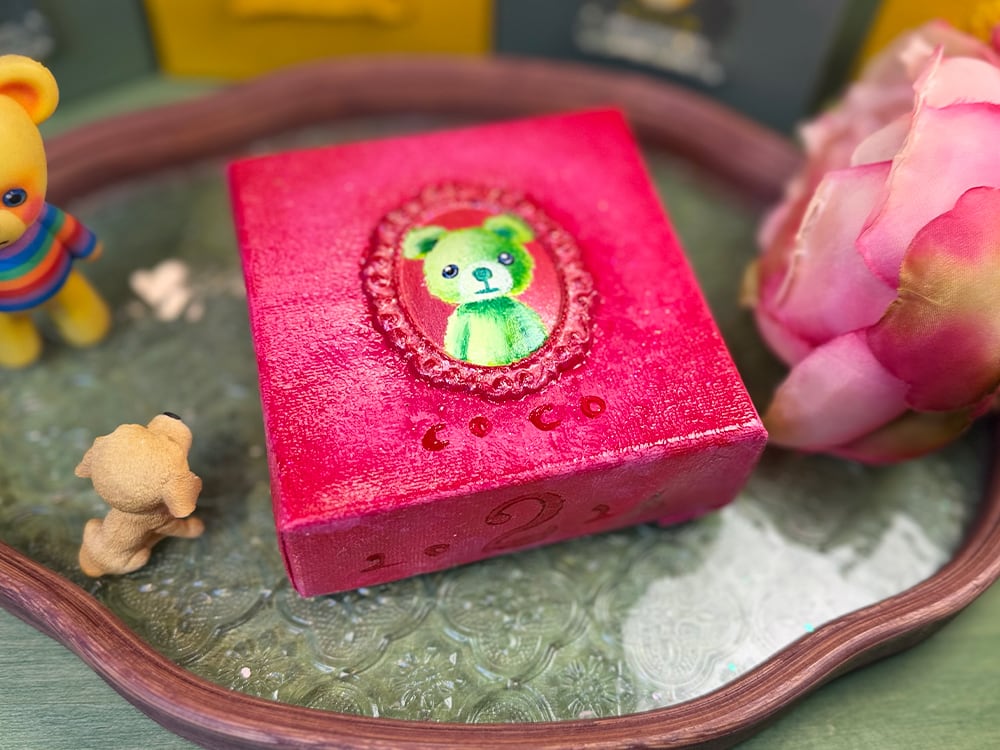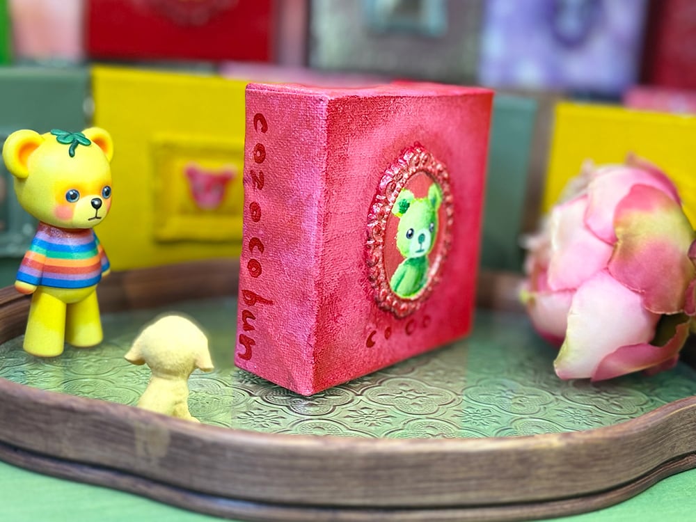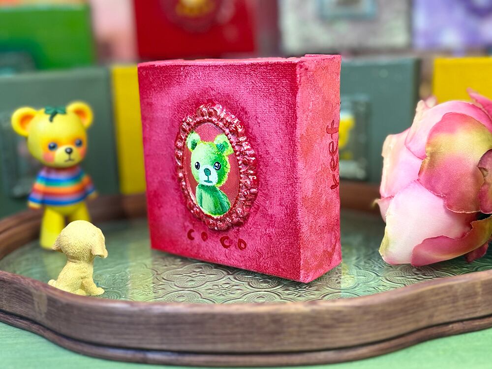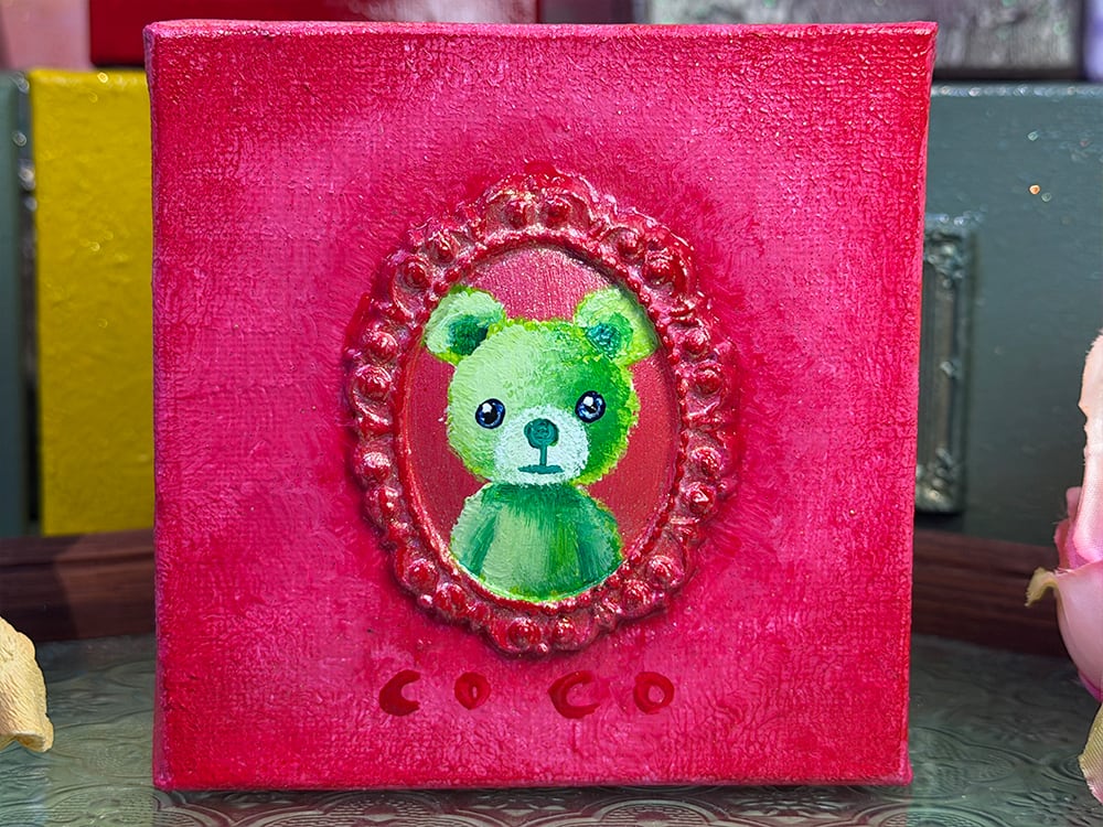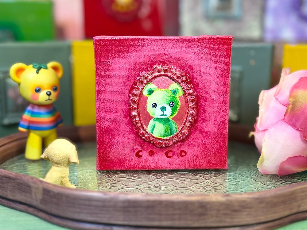 YouTube生ライブ配信で描いた作品です。独自配合した粘土で作ったアンティーク風のミニチュア額とキャンバスが赤色で統一されており、そこに【黄緑のcocoくま】が描かれた作品。壁に飾るのはもちろん、厚みがあるのでキャビネットやコレクションケースに置いた状態で飾ることができる3Dキャンバスの作品です。