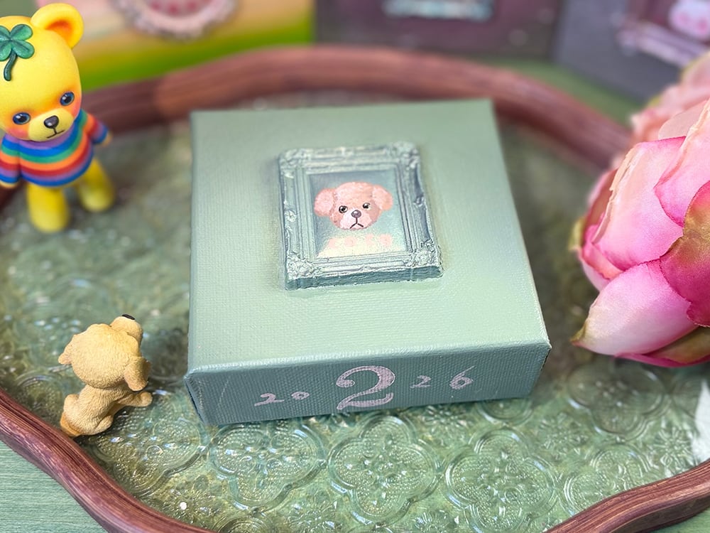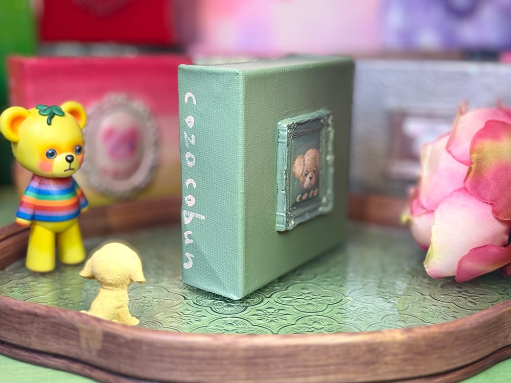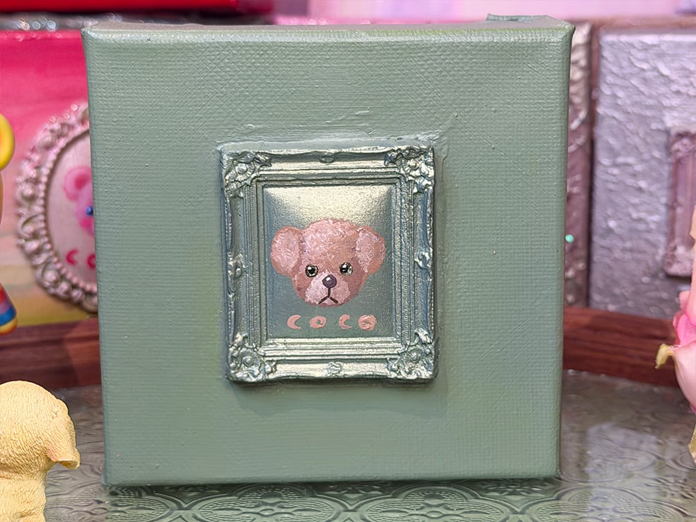 YouTube生ライブ配信で描いた作品です。独自配合した粘土で作ったアンティーク風のミニチュア額とキャンバスがモスグリーンで統一されており、そこに【茶ピンクのcocoミミ】が描かれた作品。壁に飾るのはもちろん、厚みがあるのでキャビネットやコレクションケースに置いた状態で飾ることができる3Dキャンバスの作品です。