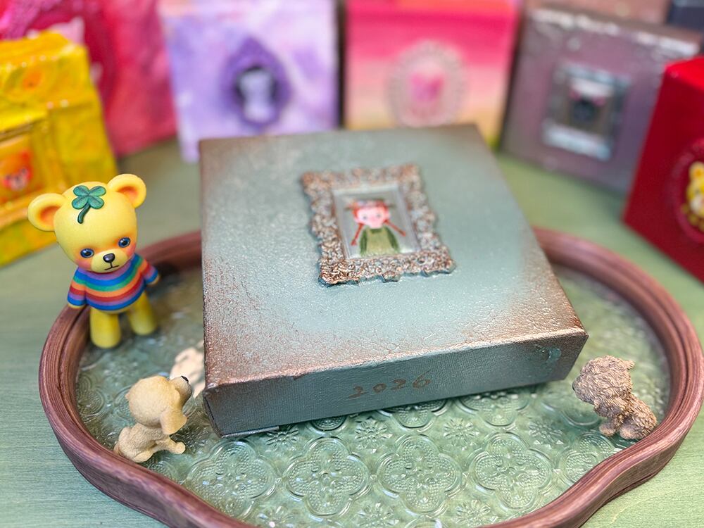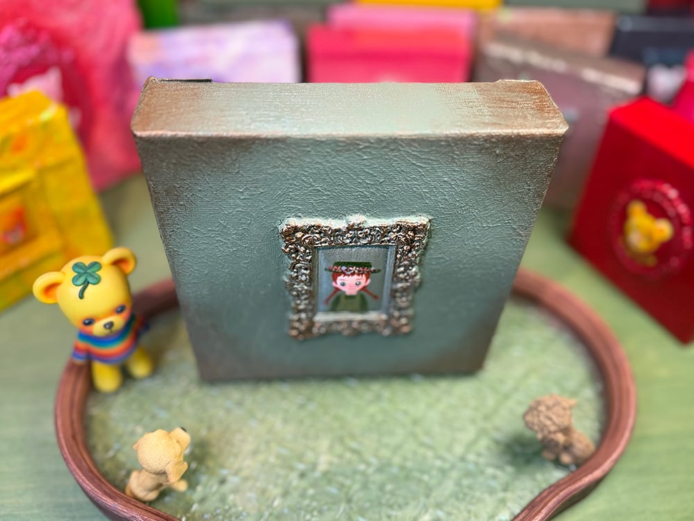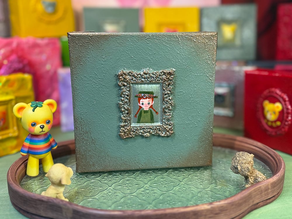 YouTube生ライブ配信で描いた作品です。独自配合した粘土で作ったアンティーク風のミニチュア額と、そこに【cocoオリジナルの赤毛のアン】が描かれた作品。壁に飾るのはもちろん、厚みがあるのでキャビネットやコレクションケースに置いた状態で飾ることができる3Dキャンバスの作品です。