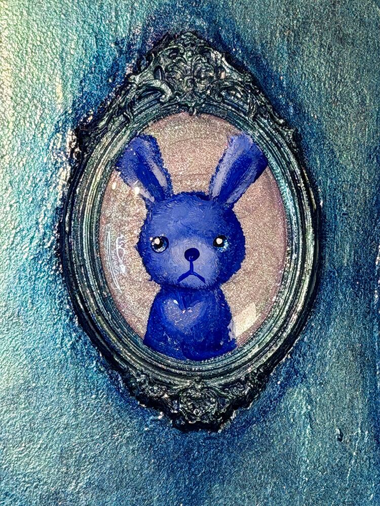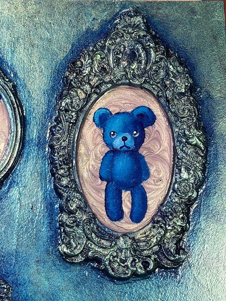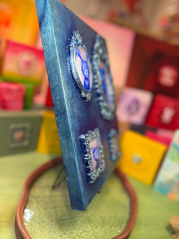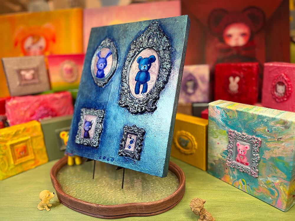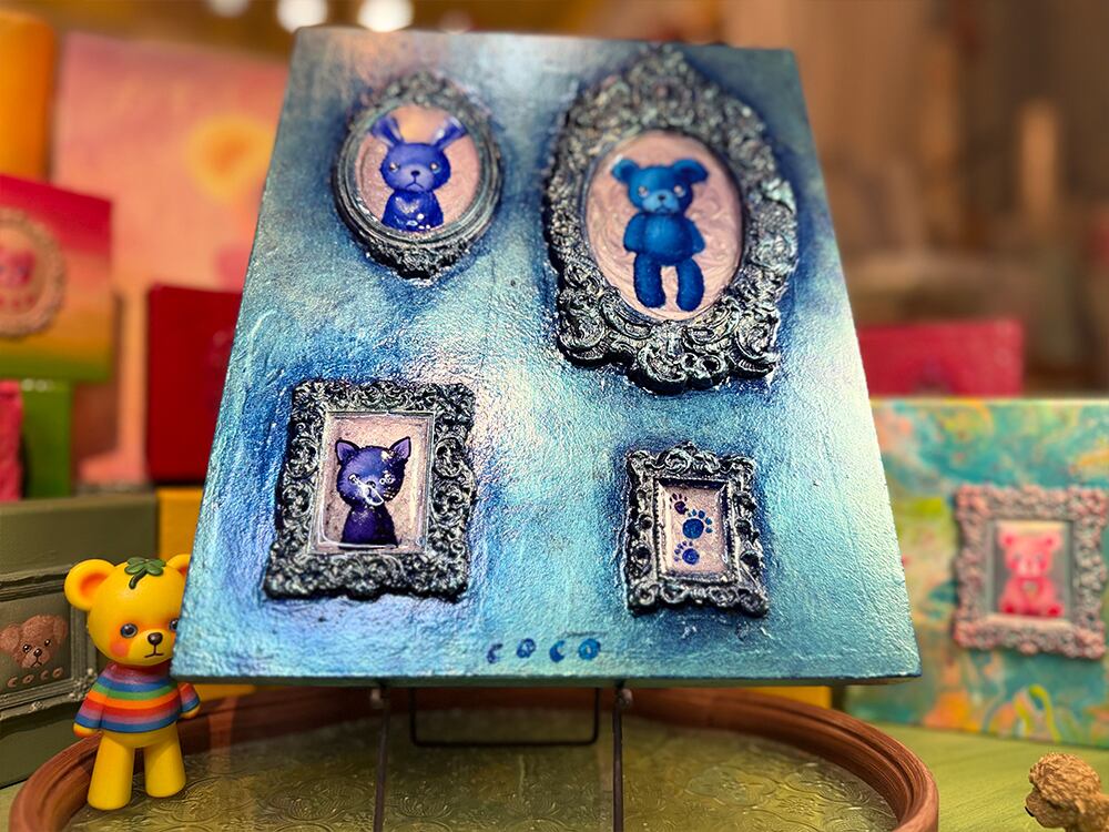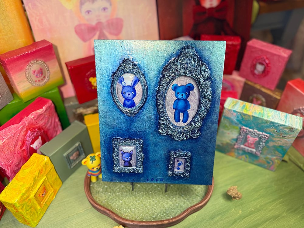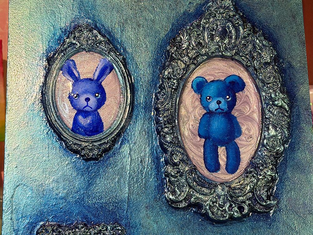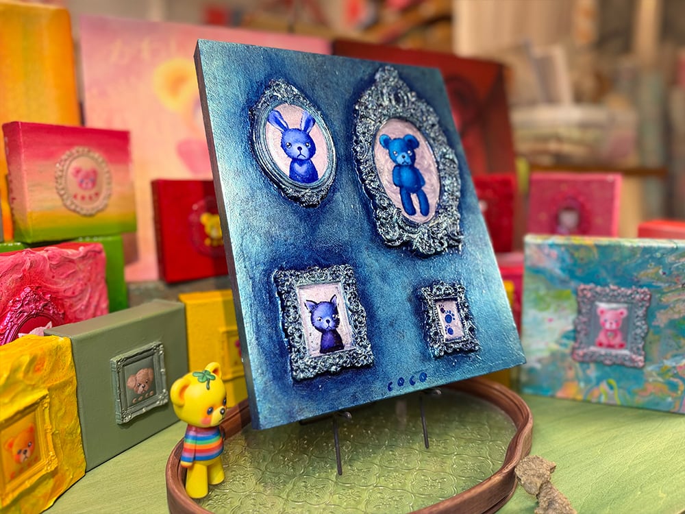 うさぎ、くま、ねこ、そして小さな足跡。主役がひとりじゃないのに、不思議と散らからず、むしろ整って見えるのは、配置のリズムと、額縁の重厚さが「記憶を飾る」という行為そのものを描いているから。