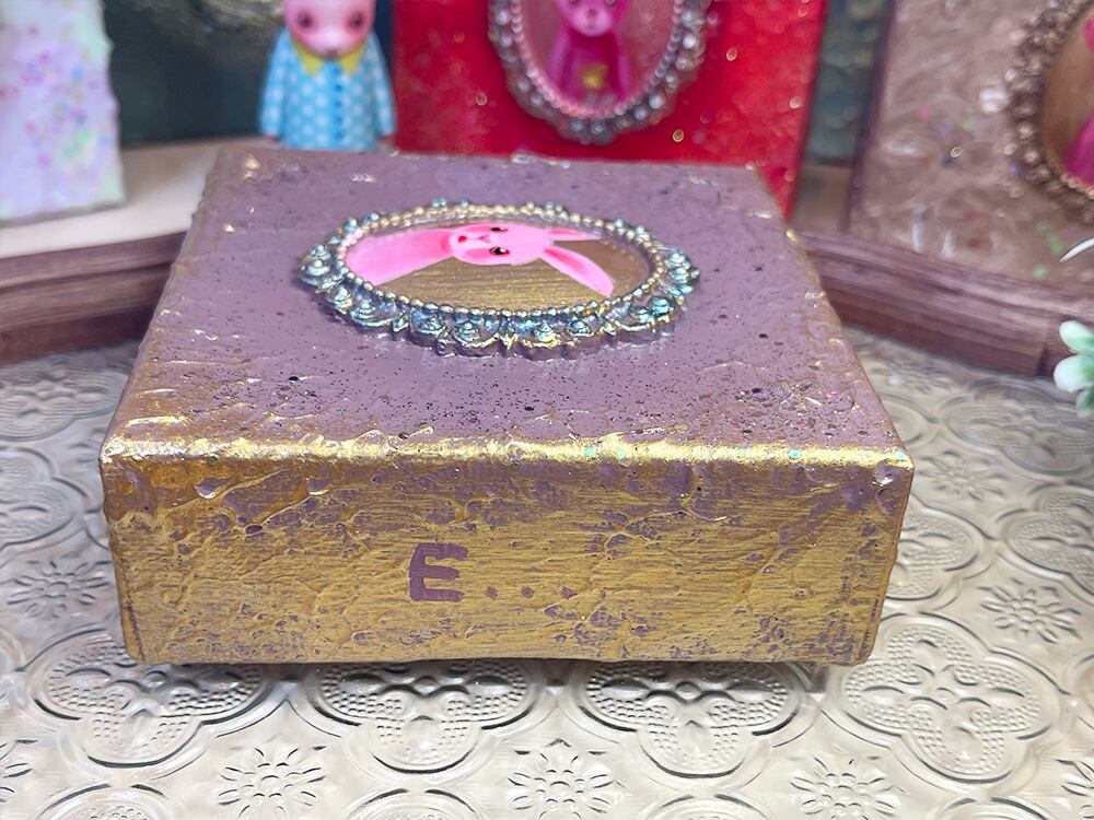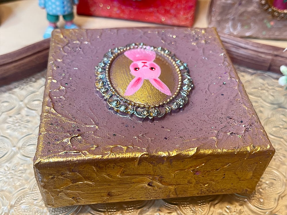 YouTube生ライブ配信で描いた作品です。独自配合した粘土で作ったアンティーク風のミニチュア額と、そこに【ピンクの愛らしい表情のcocoミミ】が描かれた作品。壁に飾るのはもちろん、厚みがあるのでキャビネットやコレクションケースに置いた状態で飾ることができる3Dキャンバスの作品です。