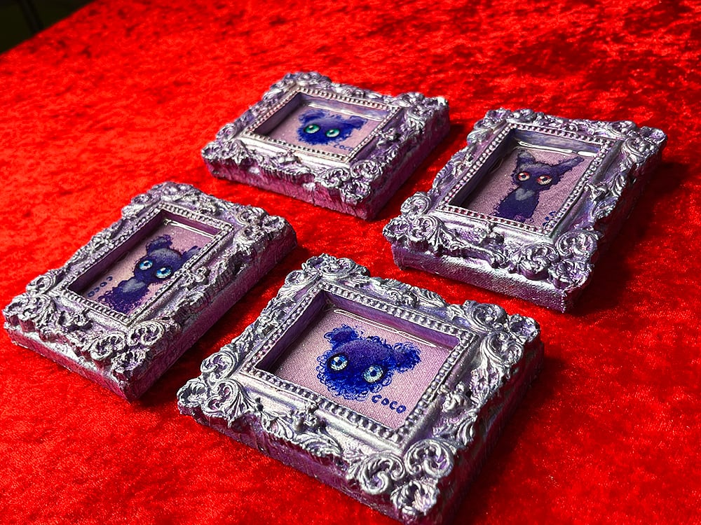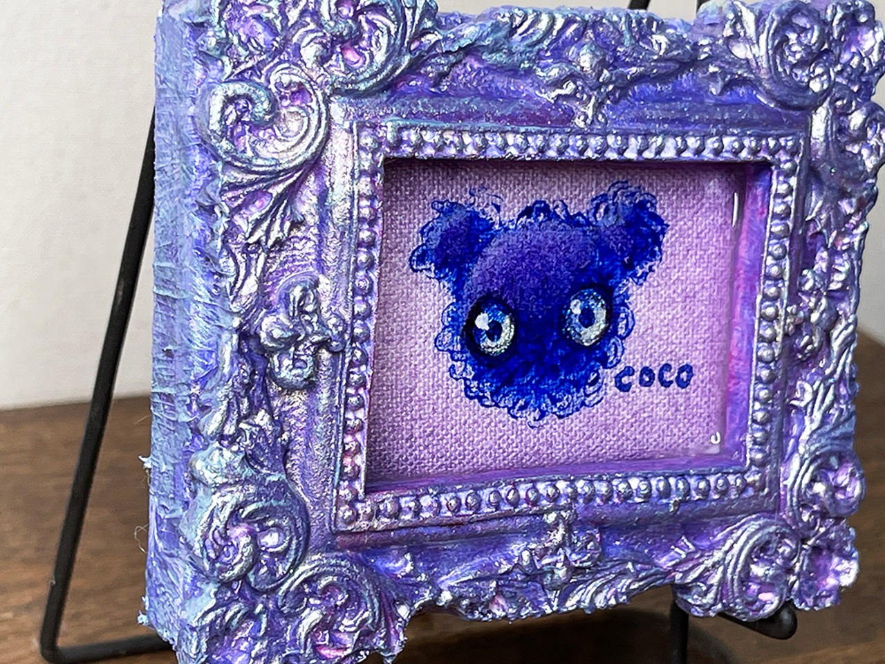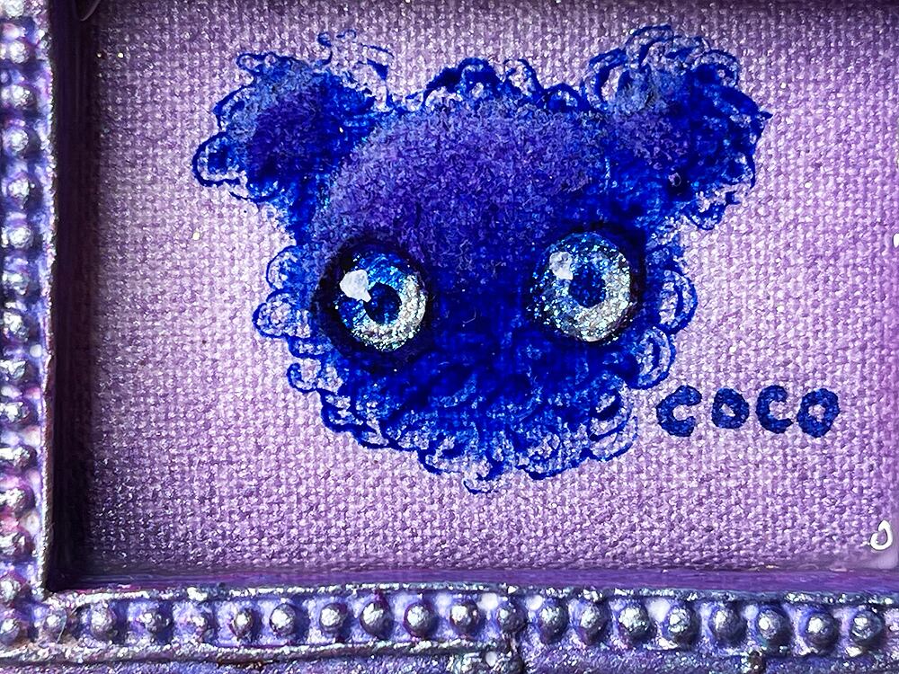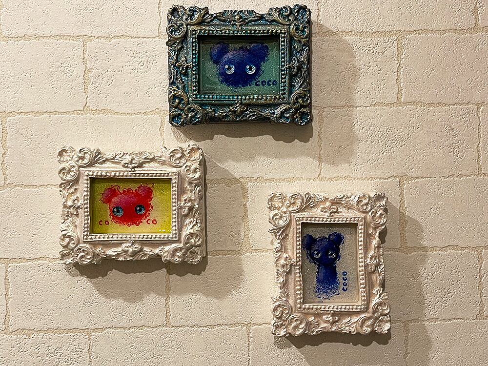 ミニチュアキャンバスにcocoくまを描き、石粉粘土でアンティーク風の額を作り、合体させた印籠サイズのミニチュア作品です。作品タイトルは生ライブに参加された視聴者様から公募して付けています。