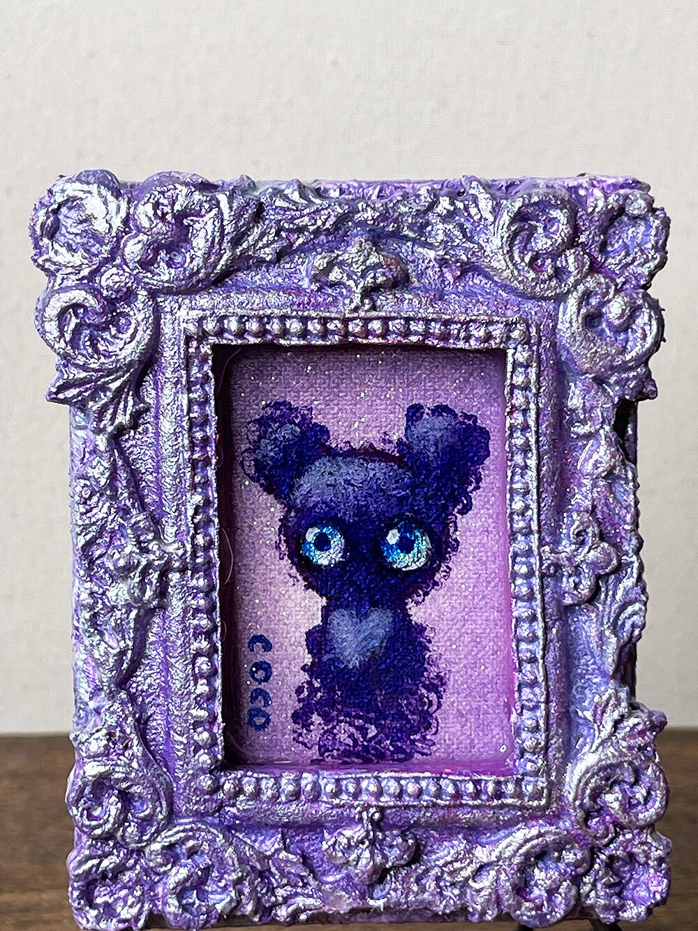 ミニチュアキャンバスにcocoくまを描き、石粉粘土でアンティーク風の額を作り、合体させた印籠サイズのミニチュア作品です。作品タイトルは生ライブに参加された視聴者様から公募して付けています。
