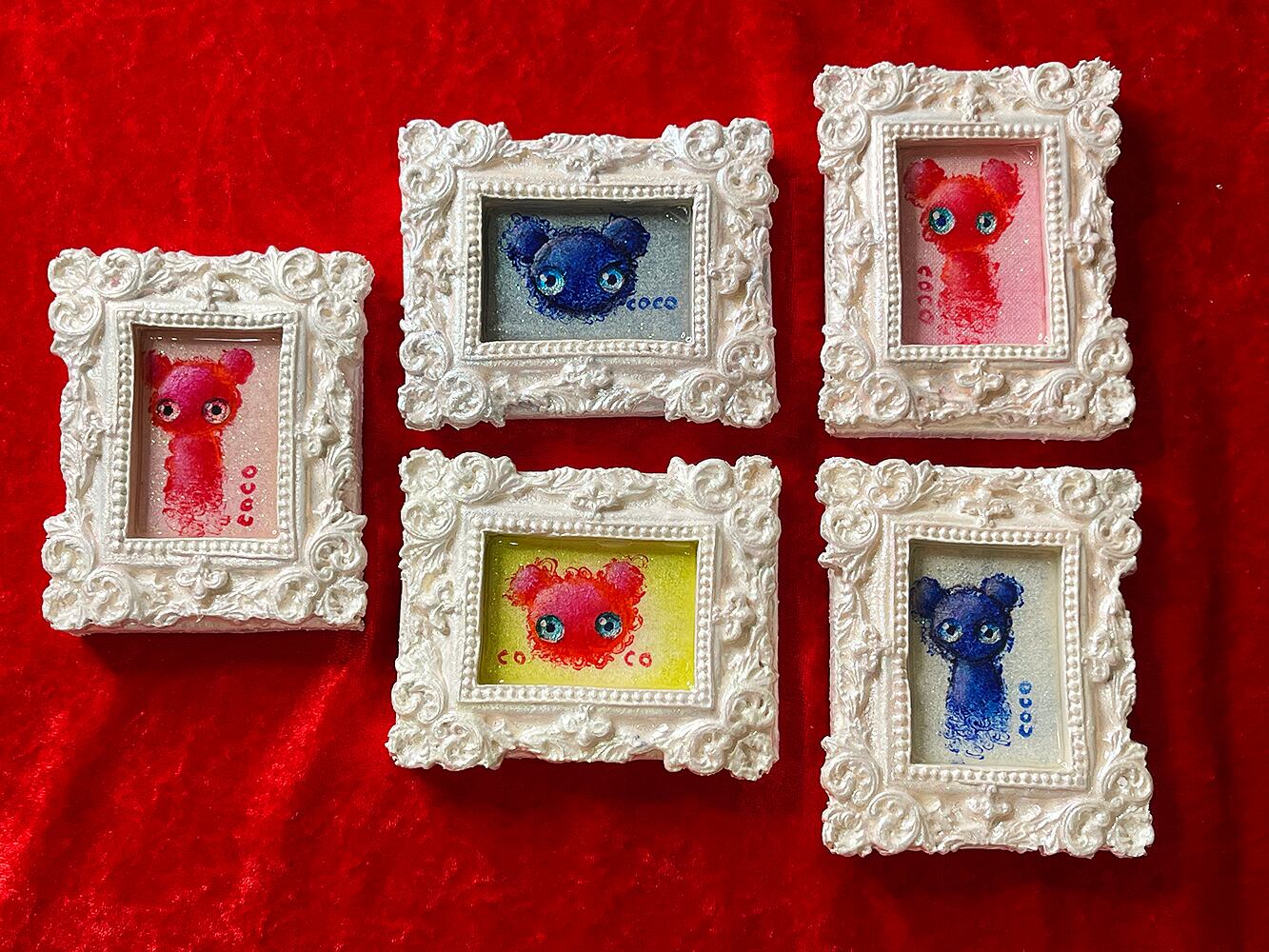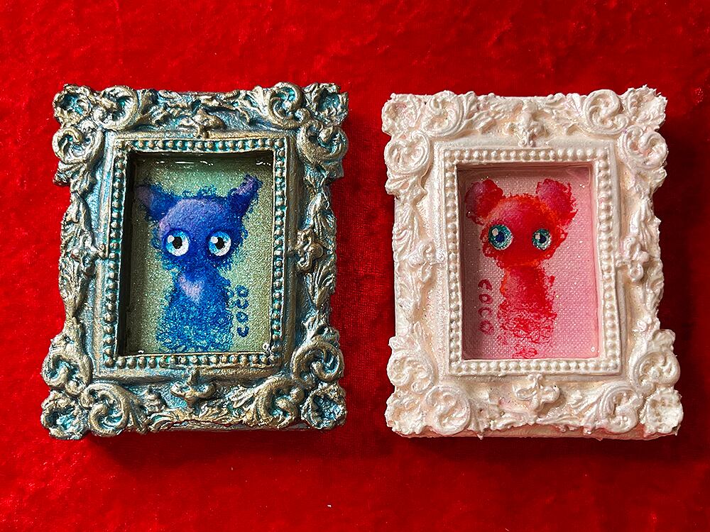 ミニチュアキャンバスにcocoくまを描き、石粉粘土でアンティーク風の額を作り、合体させた印籠サイズのミニチュア作品です。作品タイトルは生ライブに参加された視聴者様から公募して付けています。