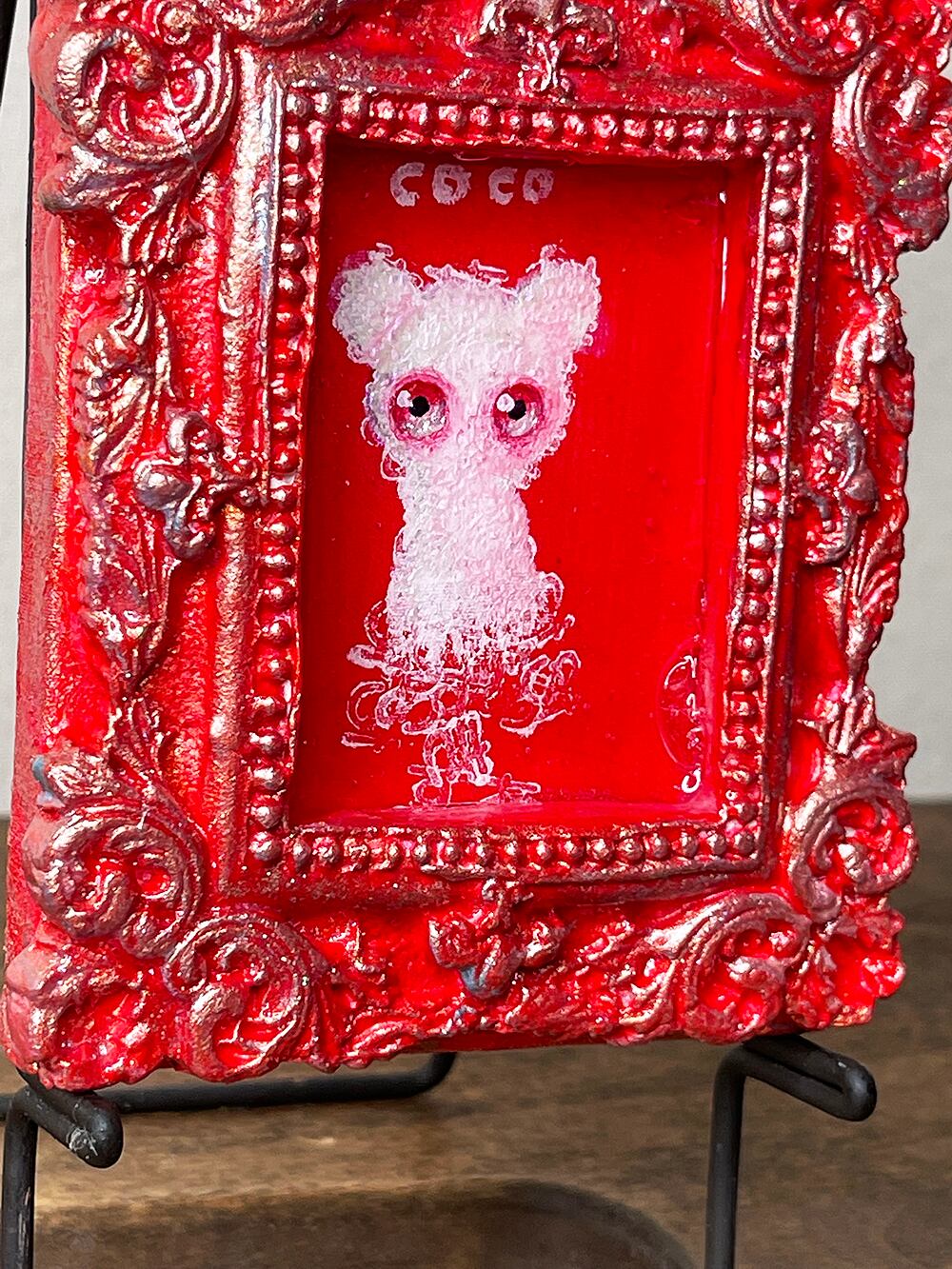 ミニチュアキャンバスにcocoくまを描き、石粉粘土でアンティーク風の額を作り、合体させた印籠サイズのミニチュア作品です。作品タイトルは生ライブに参加された視聴者様から公募して付けています。