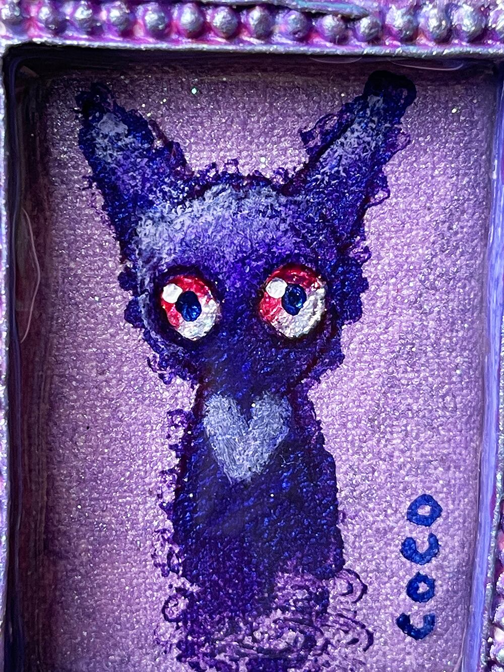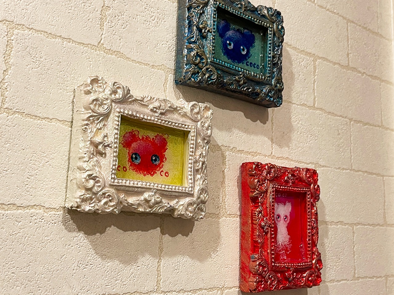 ミニチュアキャンバスにcocoくまを描き、石粉粘土でアンティーク風の額を作り、合体させた印籠サイズのミニチュア作品です。作品タイトルは生ライブに参加された視聴者様から公募して付けています。