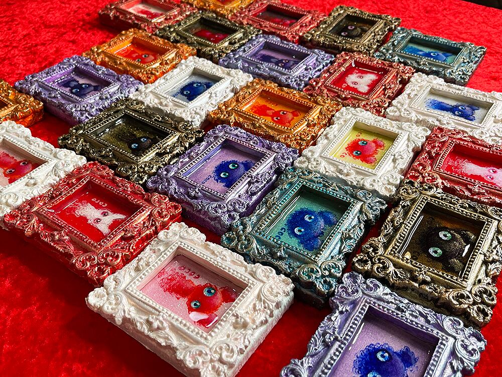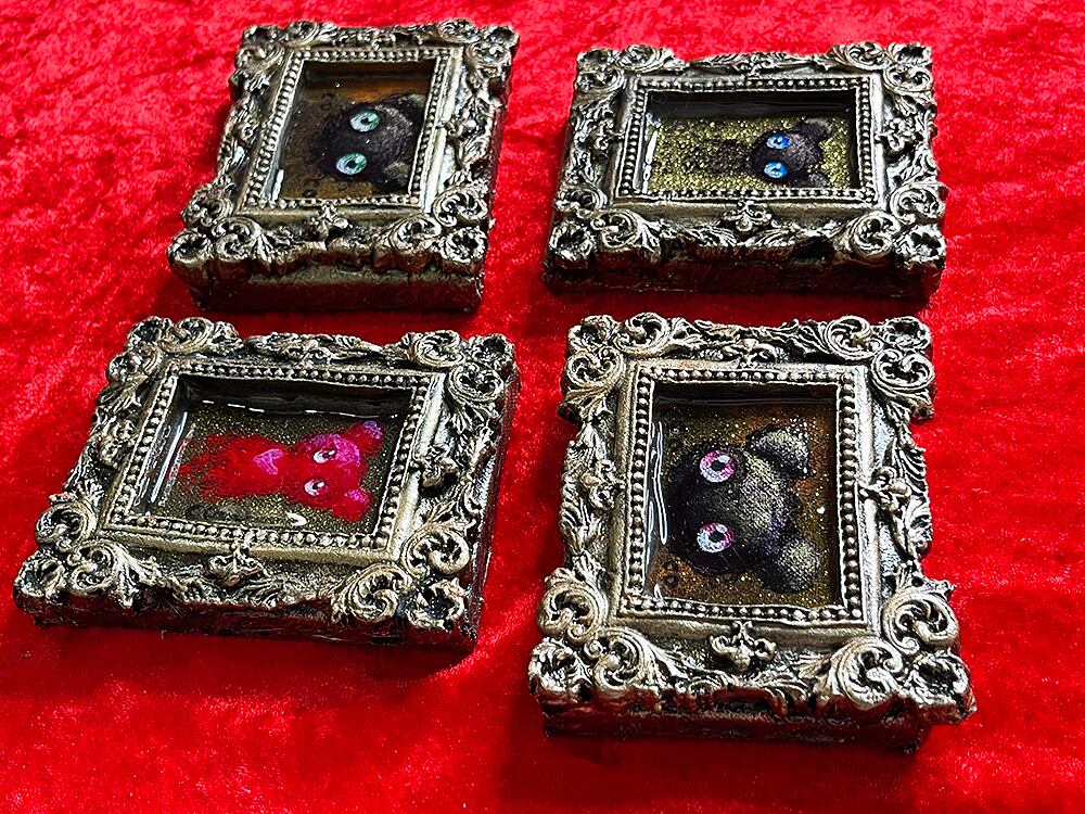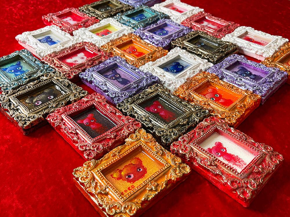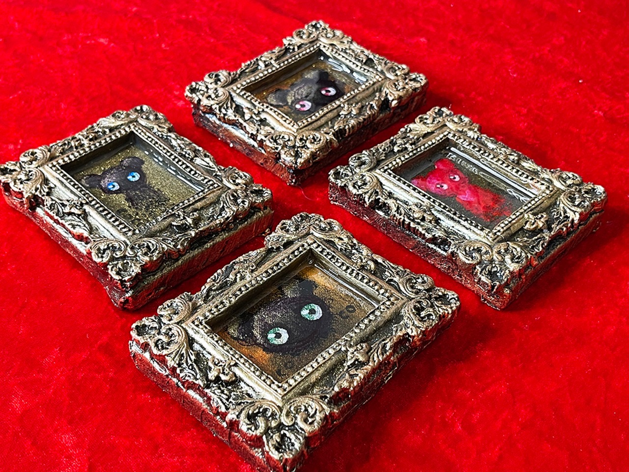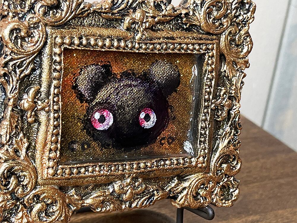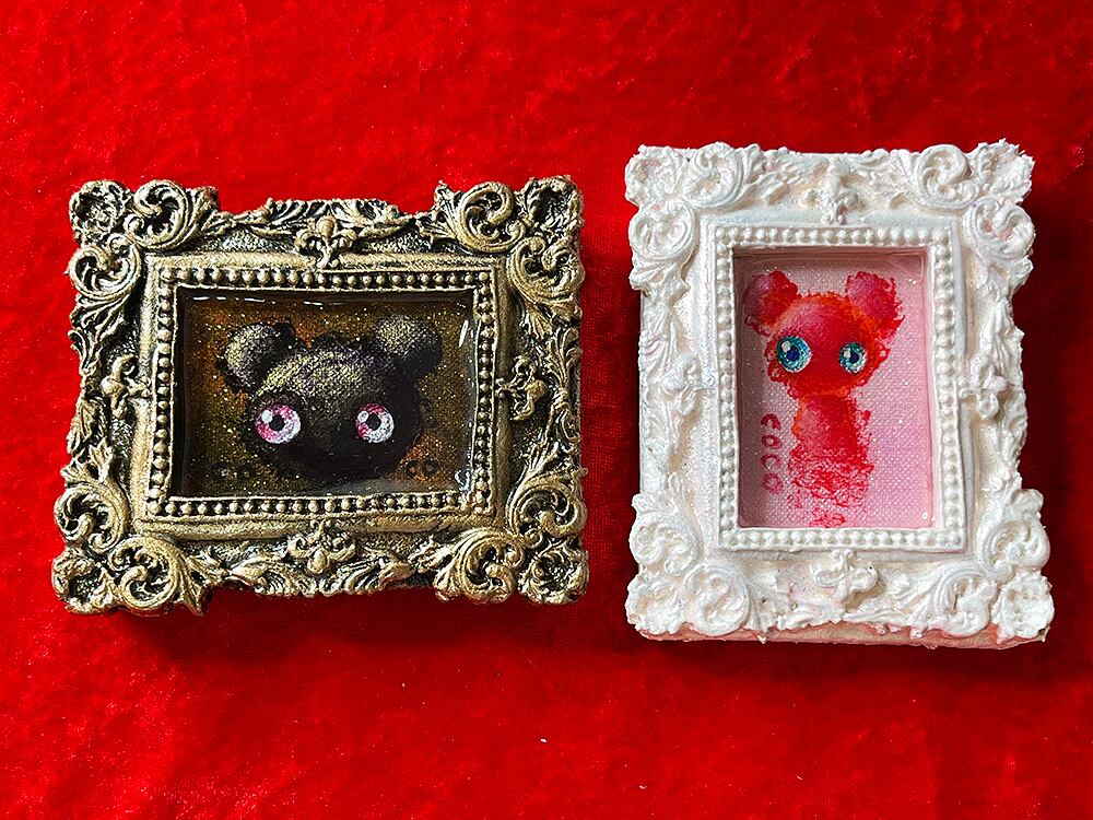 ミニチュアキャンバスにcocoくまを描き、石粉粘土でアンティーク風の額を作り、合体させた印籠サイズのミニチュア作品です。作品タイトルは生ライブに参加された視聴者様から公募して付けています。