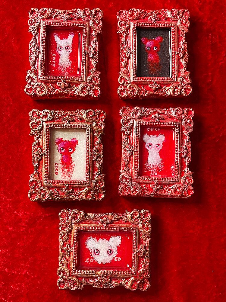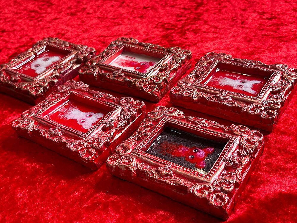 ミニチュアキャンバスにcocoくまを描き、石粉粘土でアンティーク風の額を作り、合体させた印籠サイズのミニチュア作品です。作品タイトルは生ライブに参加された視聴者様から公募して付けています。
