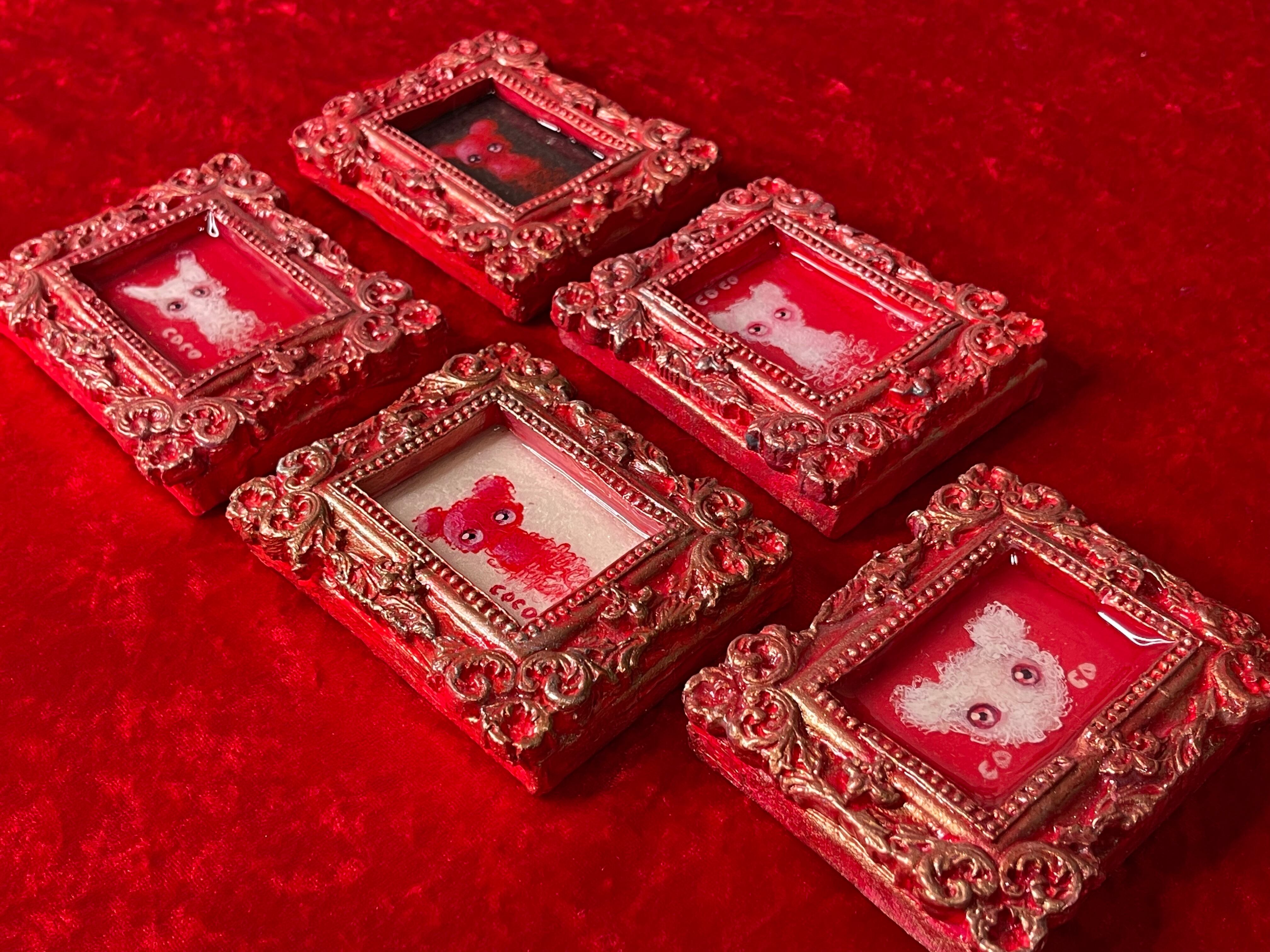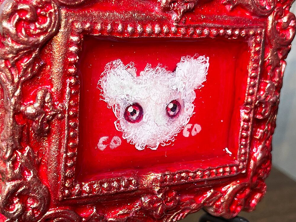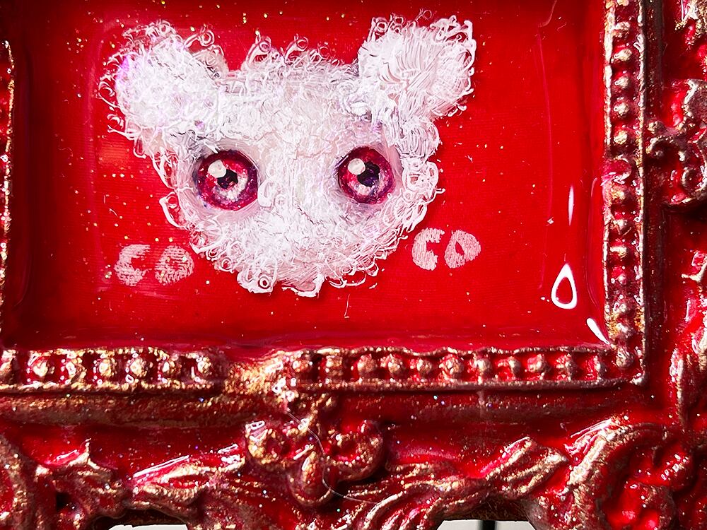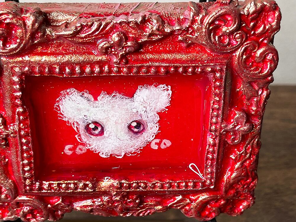 ミニチュアキャンバスにcocoくまを描き、石粉粘土でアンティーク風の額を作り、合体させた印籠サイズのミニチュア作品です。作品タイトルは生ライブに参加された視聴者様から公募して付けています。