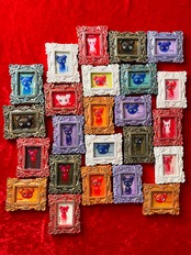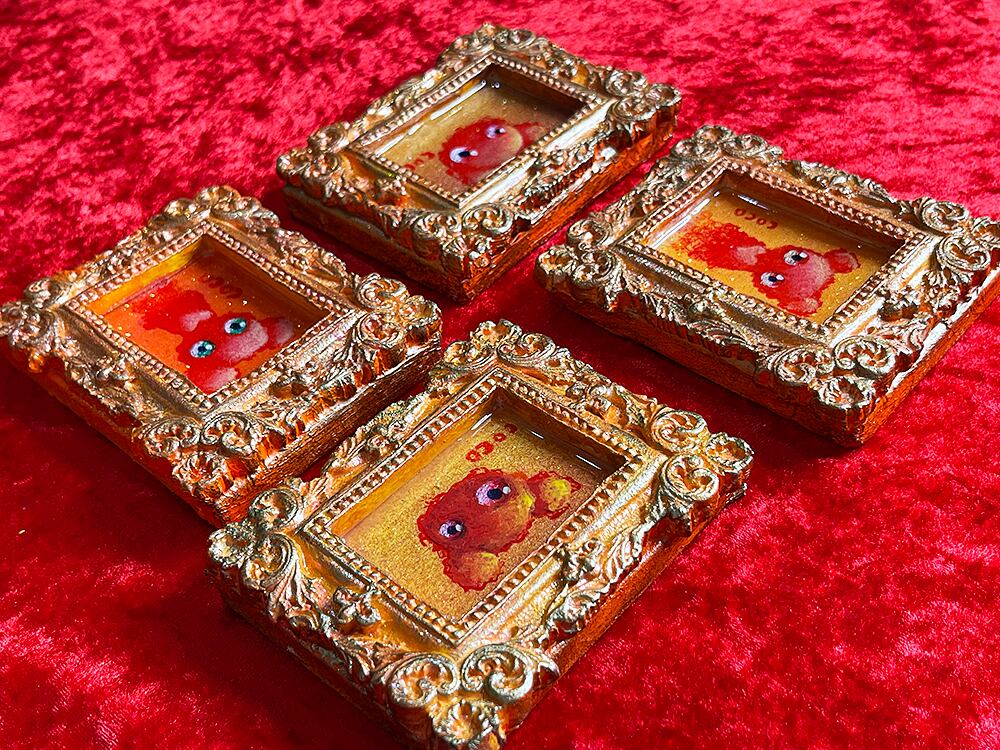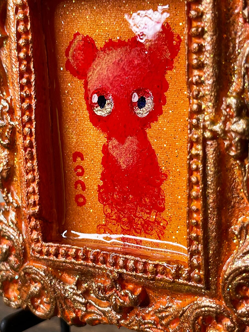 ミニチュアキャンバスにcocoくまを描き、石粉粘土でアンティーク風の額を作り、合体させた印籠サイズのミニチュア作品です。作品タイトルは生ライブに参加された視聴者様から公募して付けています。