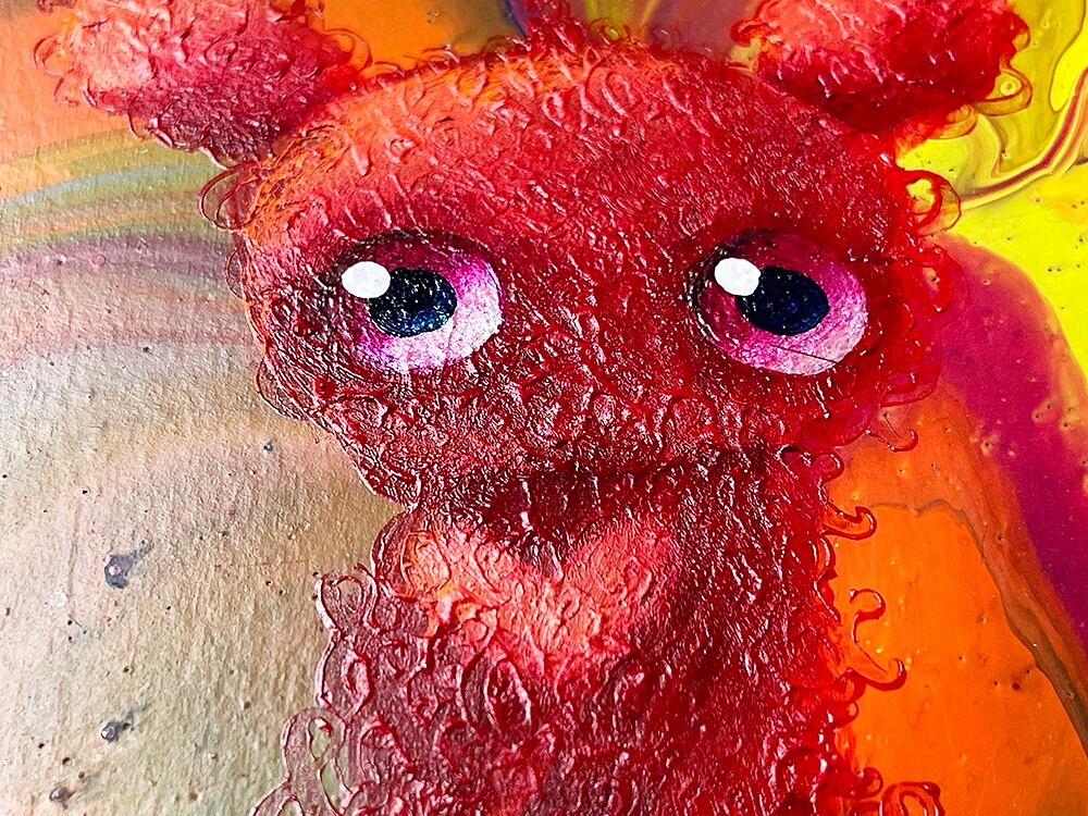カラフルなポーリングの上に、独特な瞳を持つcocoオリジナルのぬいぐるみをポートレートとして描いた作品です。