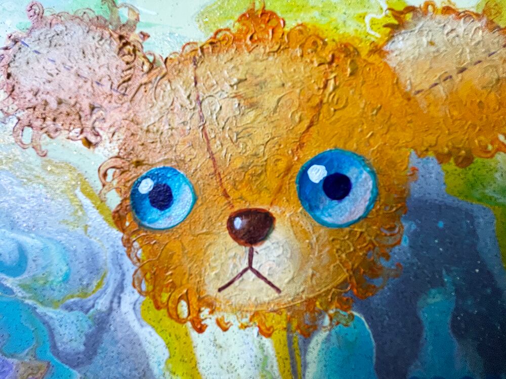 カラフルなポーリングの上に、独特な瞳を持つcocoオリジナルのぬいぐるみをポートレートとして描いた作品です。