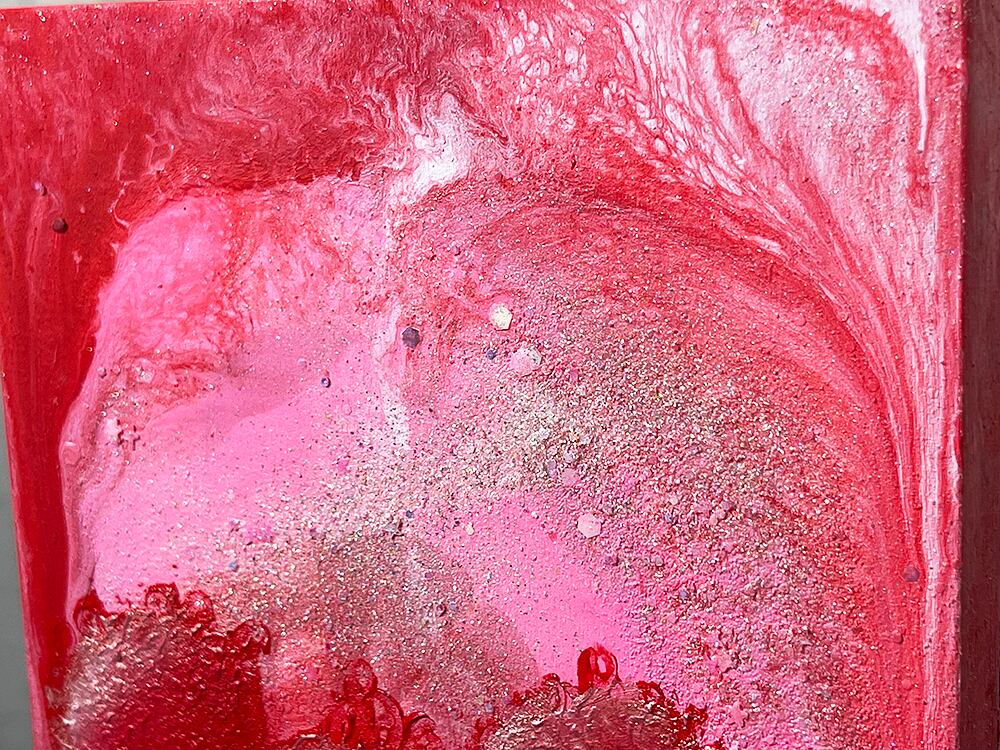 カラフルなポーリングの上に、独特な瞳を持つcocoオリジナルのぬいぐるみをポートレートとして描いた作品です。