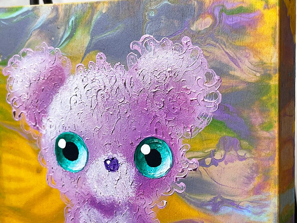 カラフルなポーリングの上に、独特な瞳を持つcocoオリジナルのぬいぐるみをポートレートとして描いた作品です。