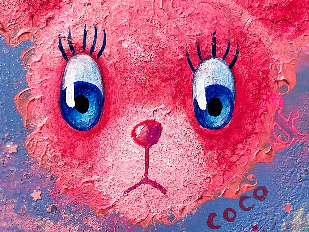 カラフルなポーリングの上に、独特な瞳を持つcocoオリジナルのぬいぐるみをポートレートとして描いた作品です。