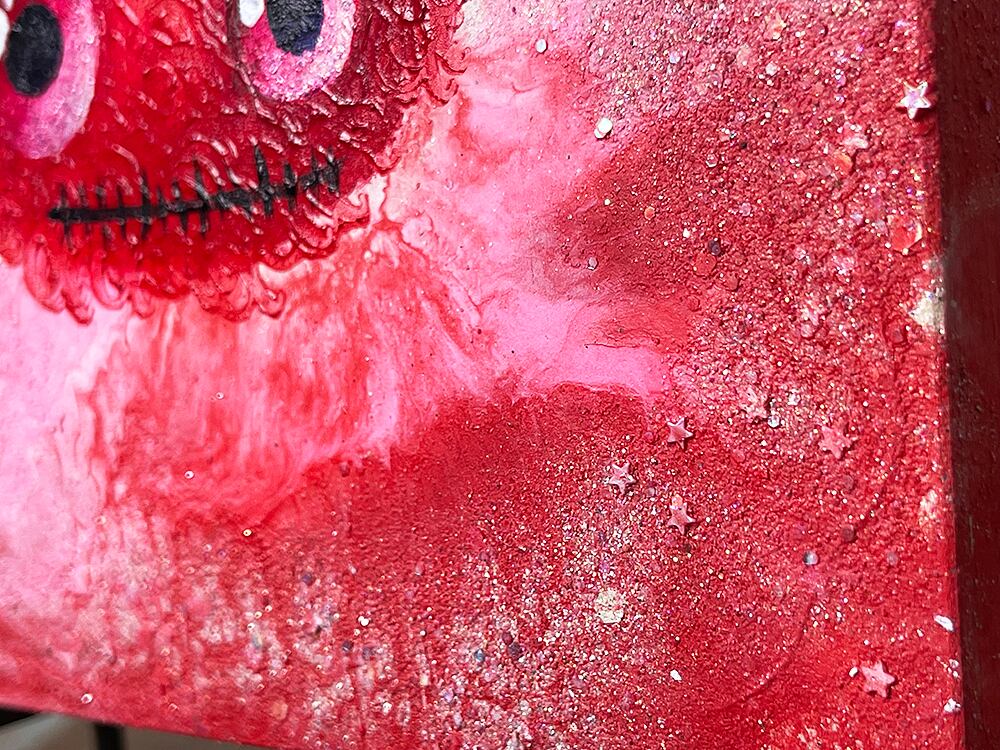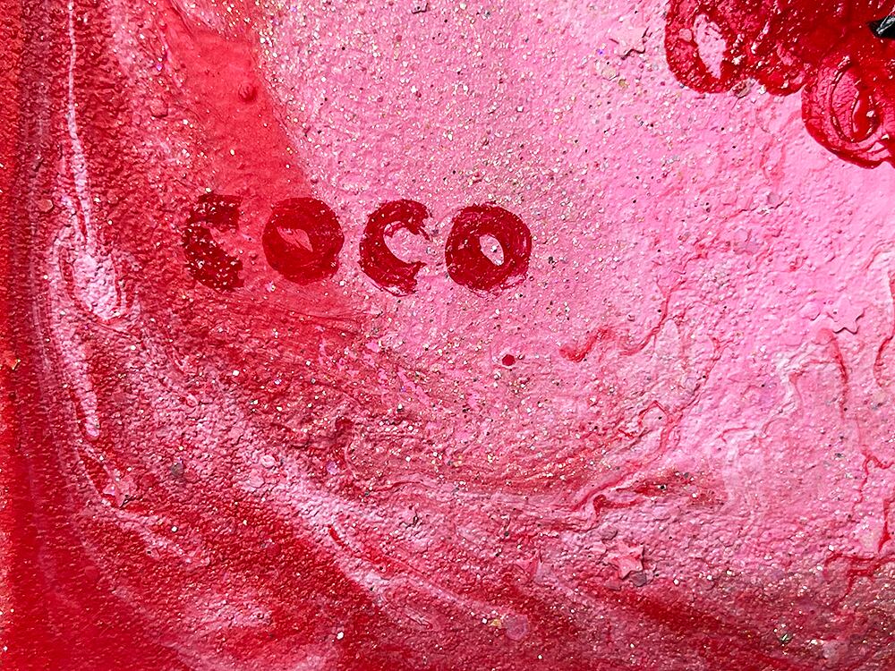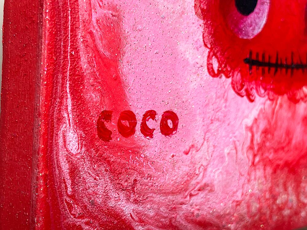カラフルなポーリングの上に、独特な瞳を持つcocoオリジナルのぬいぐるみをポートレートとして描いた作品です。