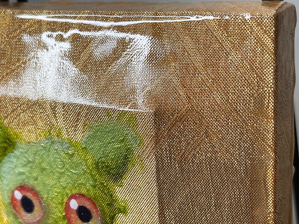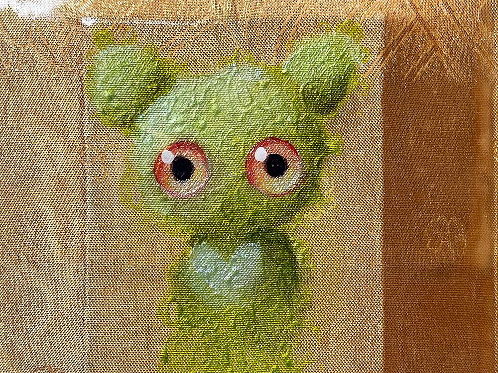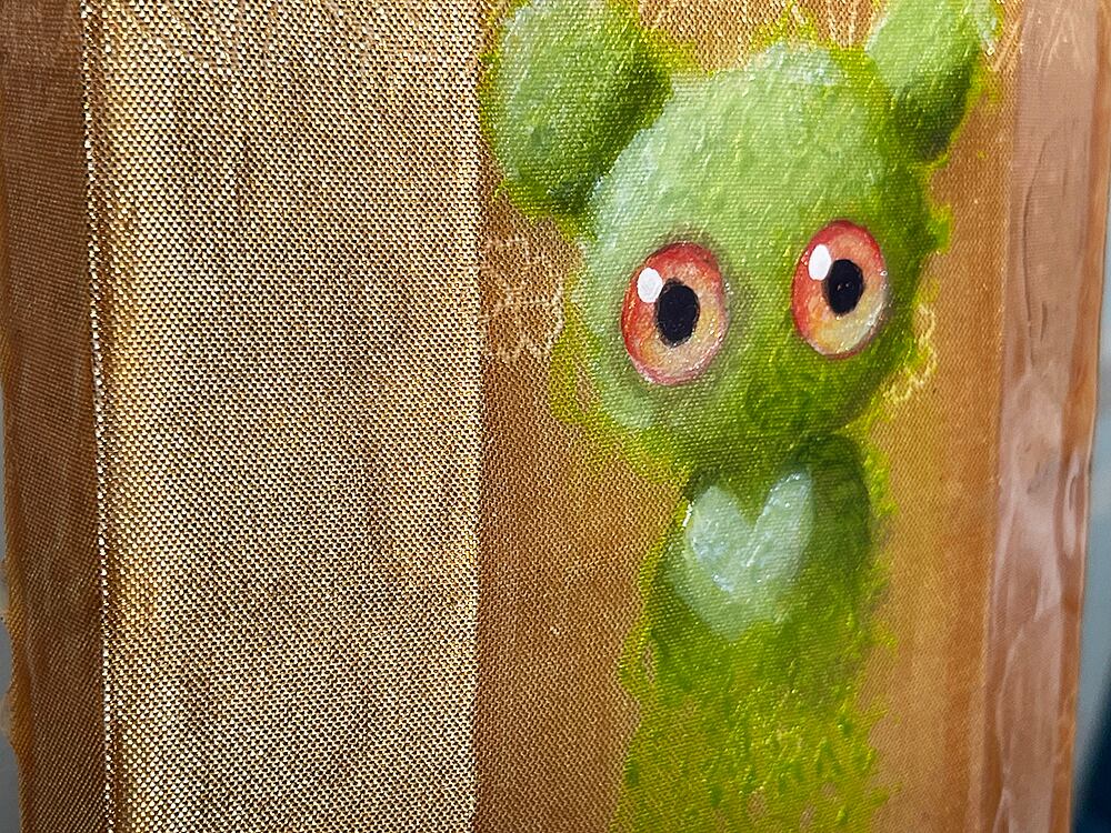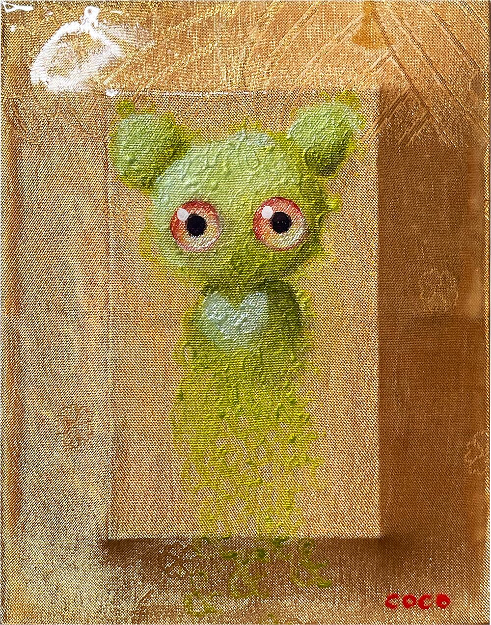 着物の帯生地に直接アクリル絵の具でcocoくまを描いた作品です。完成後、ニスで固めているため、鼈甲の様な飴細工の様なツヤがあり、金の延べ棒の様な重厚感もあります。