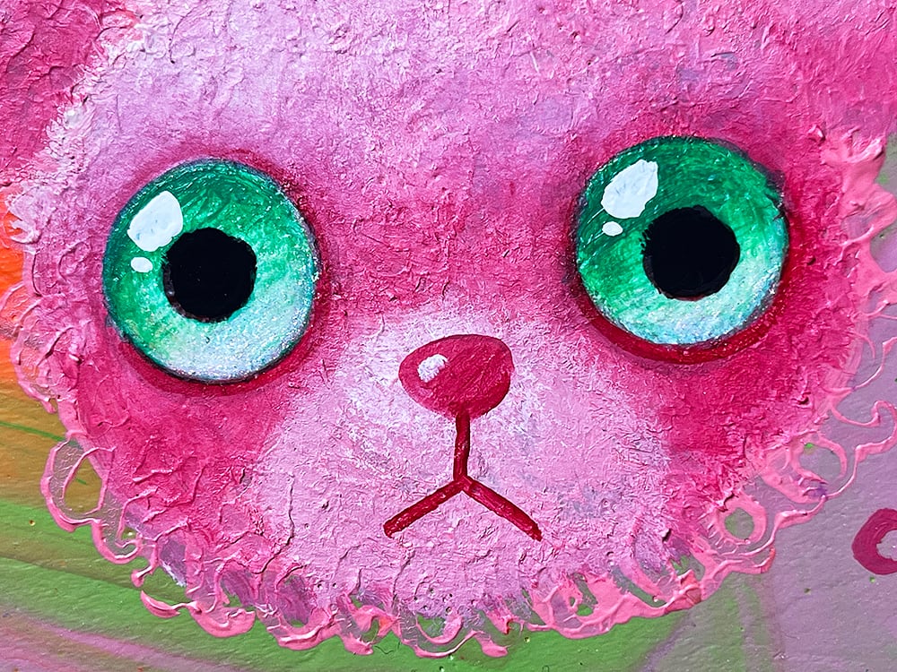 カラフルなポーリングの上に、独特な瞳を持つcocoオリジナルのぬいぐるみをポートレートとして描いた作品です。