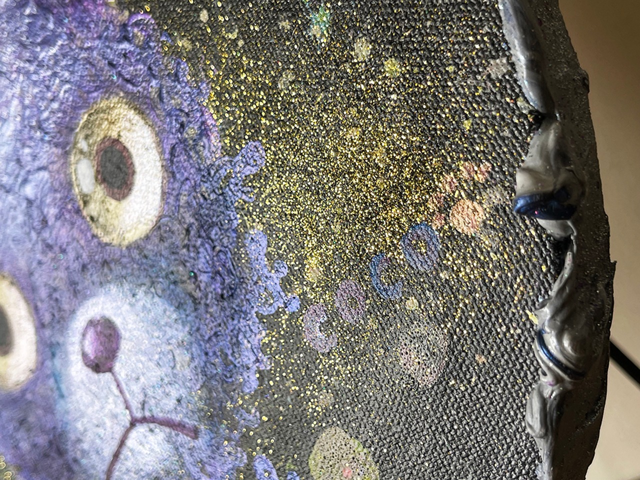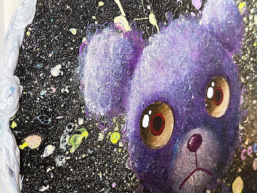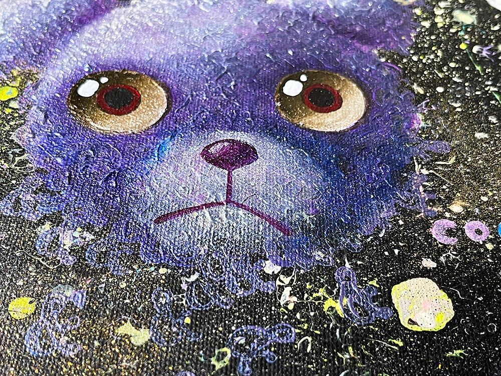 宇宙を思わせる背景に惑星色のcocoくまを描いた作品。