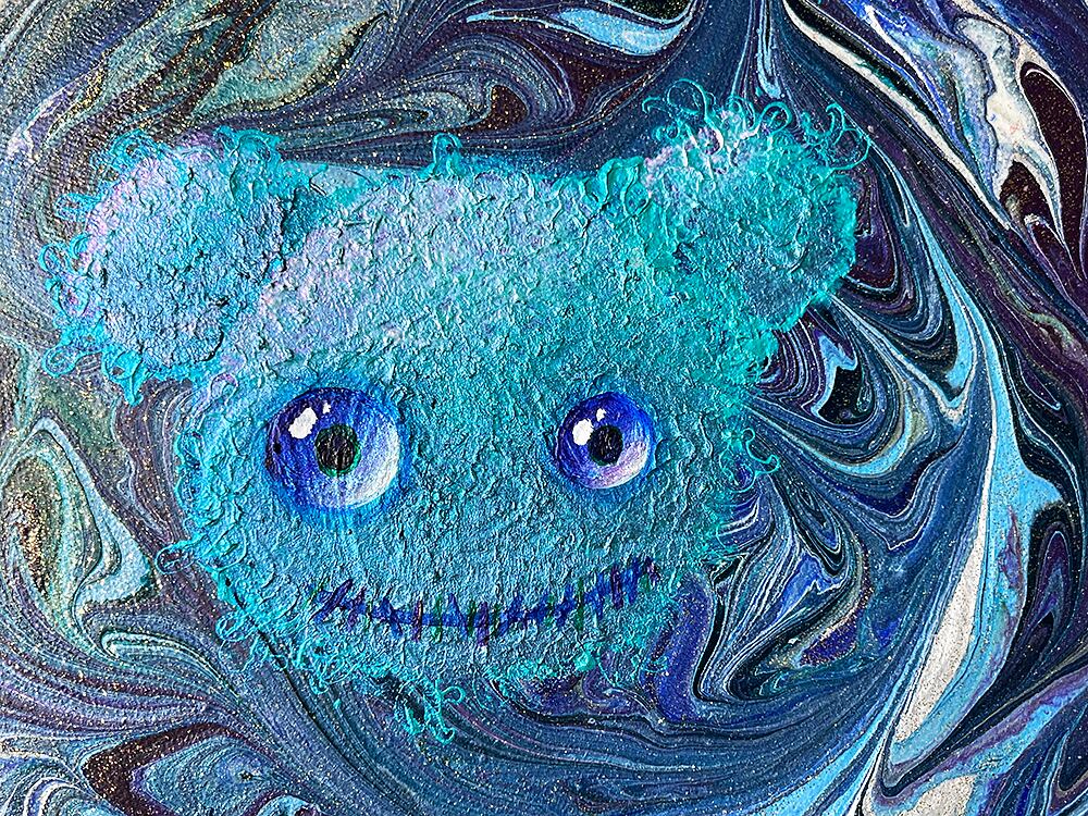 キャンバスの上に絵の具を垂らし、その上を縦横無尽にビー玉を転がして作った背景に地球を思わせる色の独特な瞳を持つcocoオリジナルのぬいぐるみをポートレートとして描いた作品です。