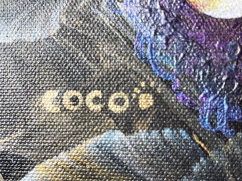 キャンバスに黒い絵の具、その上にたこ糸に絵の具を付け背景を作り、独特な瞳を持つcocoオリジナルのぬいぐるみをポートレートとして描いた作品です。