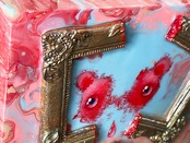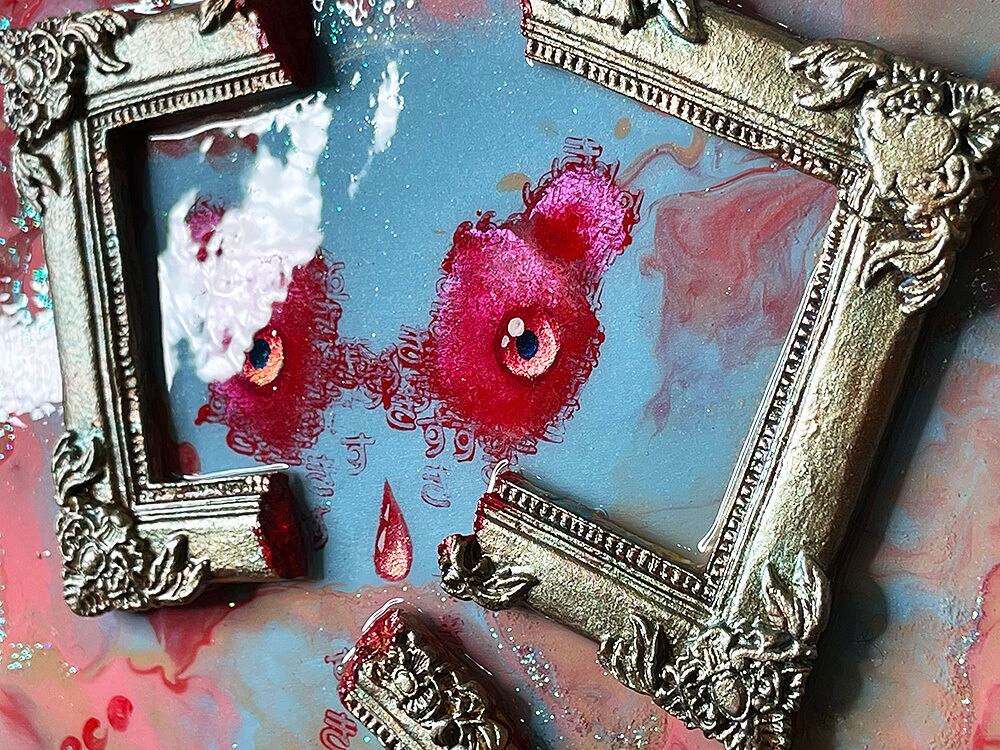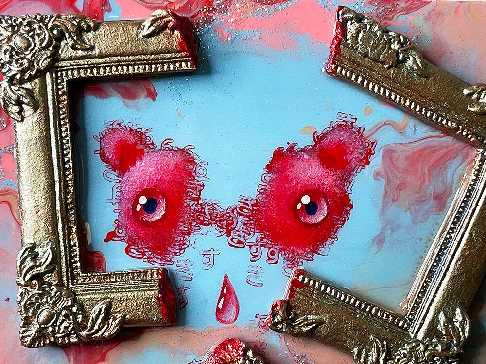カラフルなポーリングの上に、千切れた様にアレンジしたcocoくまと、石粉粘土を使用して手作りした額を同じく千切れた感じで配置したちょっと異色な作品です。
