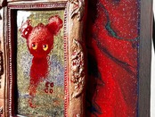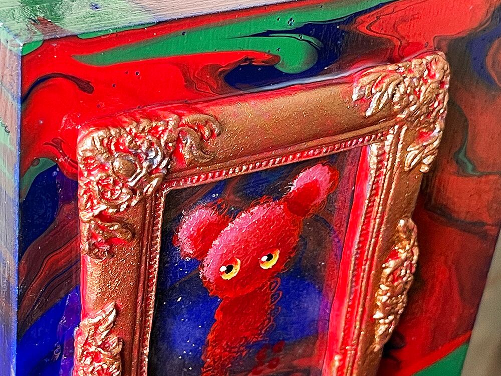 カラフルなポーリングの上に、石粉粘土を使用して手作りした小さな額を配置して、cocoくまが額に入った異色な作品です。