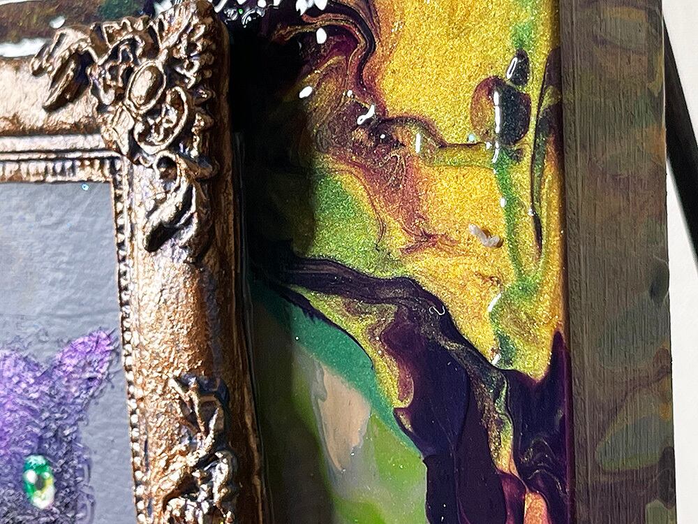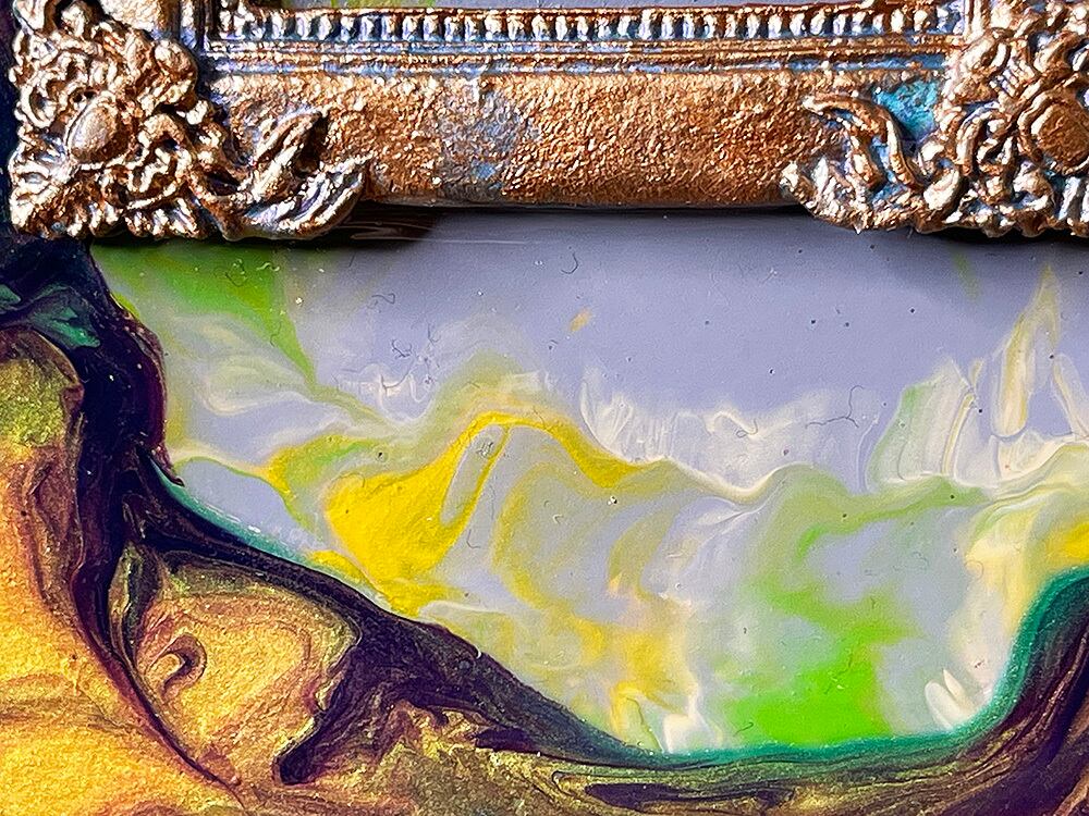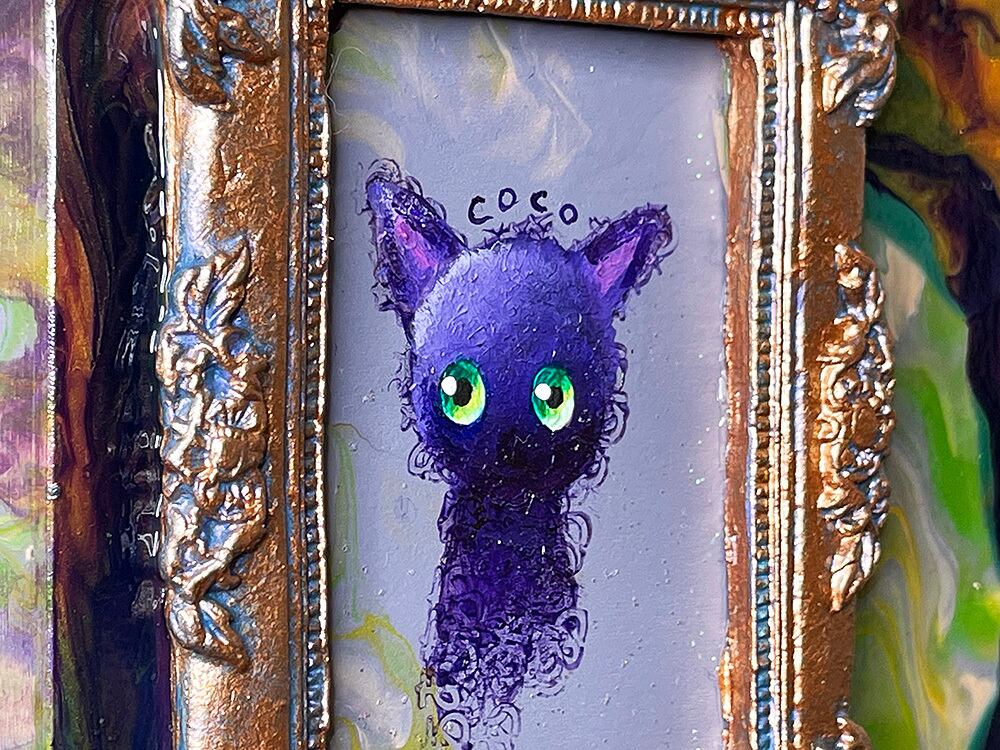 カラフルなポーリングの上に、石粉粘土を使用して手作りした小さな額を配置して、cocoくまが額に入った異色な作品です。