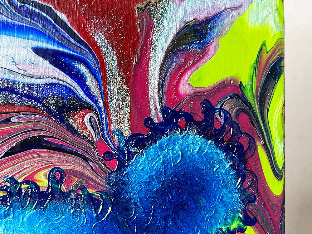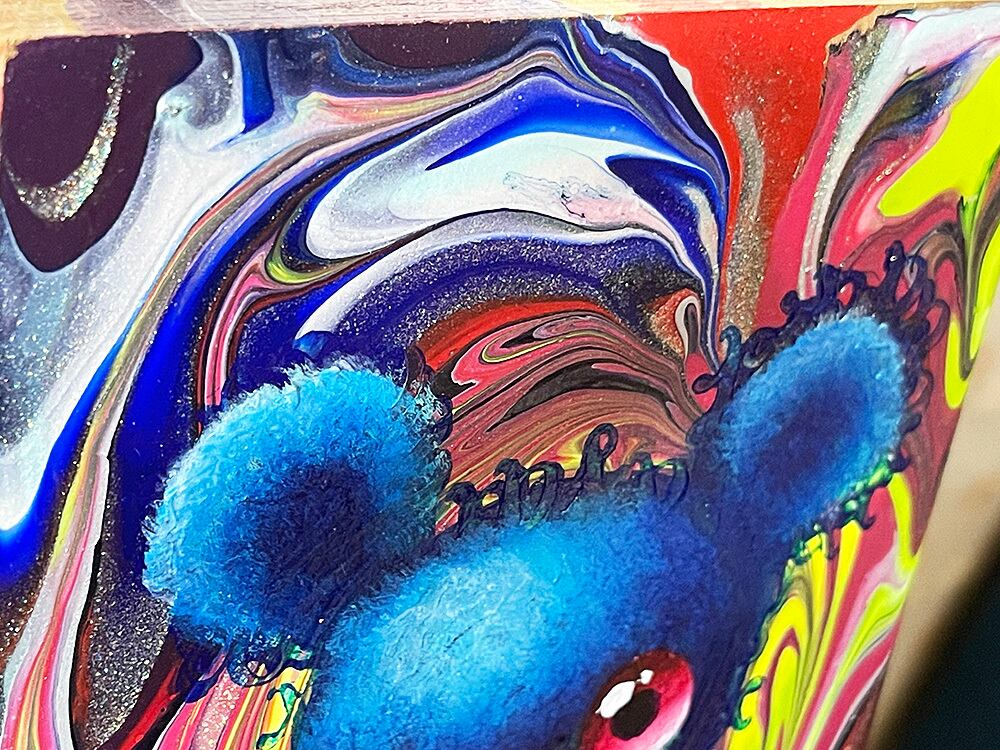 カラフルで少しダークなポーリングの上に、独特な瞳を持つcocoオリジナルのぬいぐるみをポートレートとして描いた作品です。