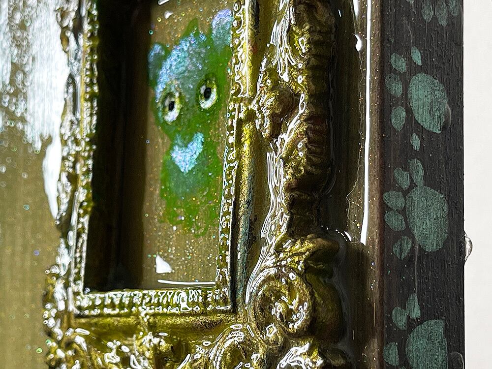 少しダークな草色を染み込ませ、木目を残したキャンバスの上に、石粉粘土を使用して手作りした小さな額を配置して、cocoくまが額に入った異色な作品です。完成後、ニスで固めているため、鼈甲の様な飴細工の様なツヤがあり、重厚感もあります。