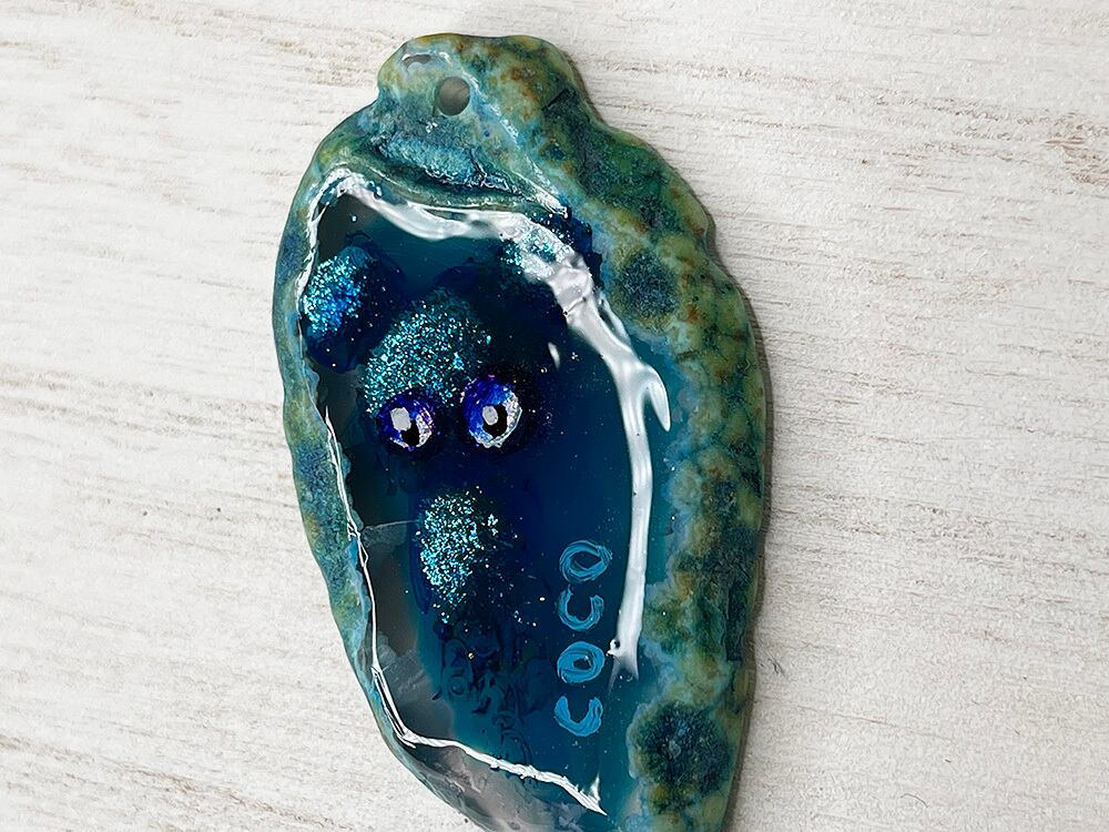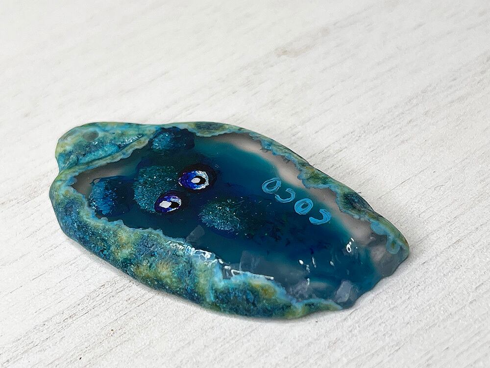 天然瑪瑙をスライスした独特な天然柄の上に、描いています。