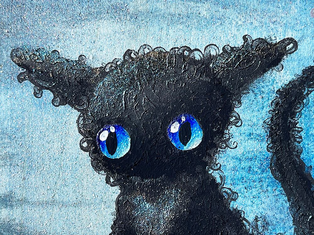 キャンバスに黒い絵の具、宇宙の様な背景を作り、独特な瞳を持つcocoオリジナルのぬいぐるみ猫をポートレートとして描いた作品です。