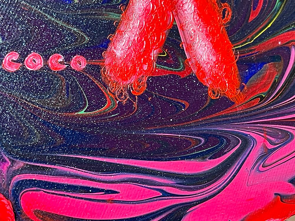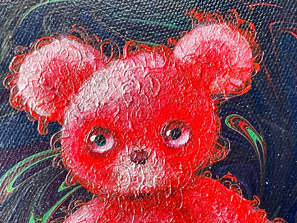 ブラックなポーリングの上に、独特な瞳を持つcocoオリジナルのぬいぐるみをポートレートとして描いた作品です。