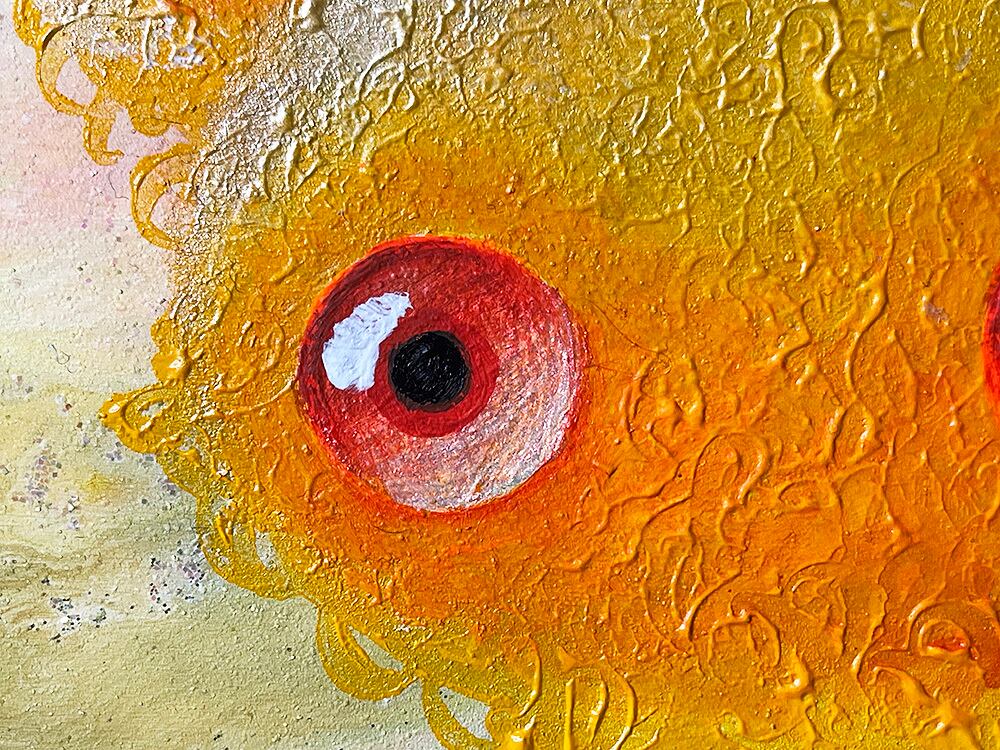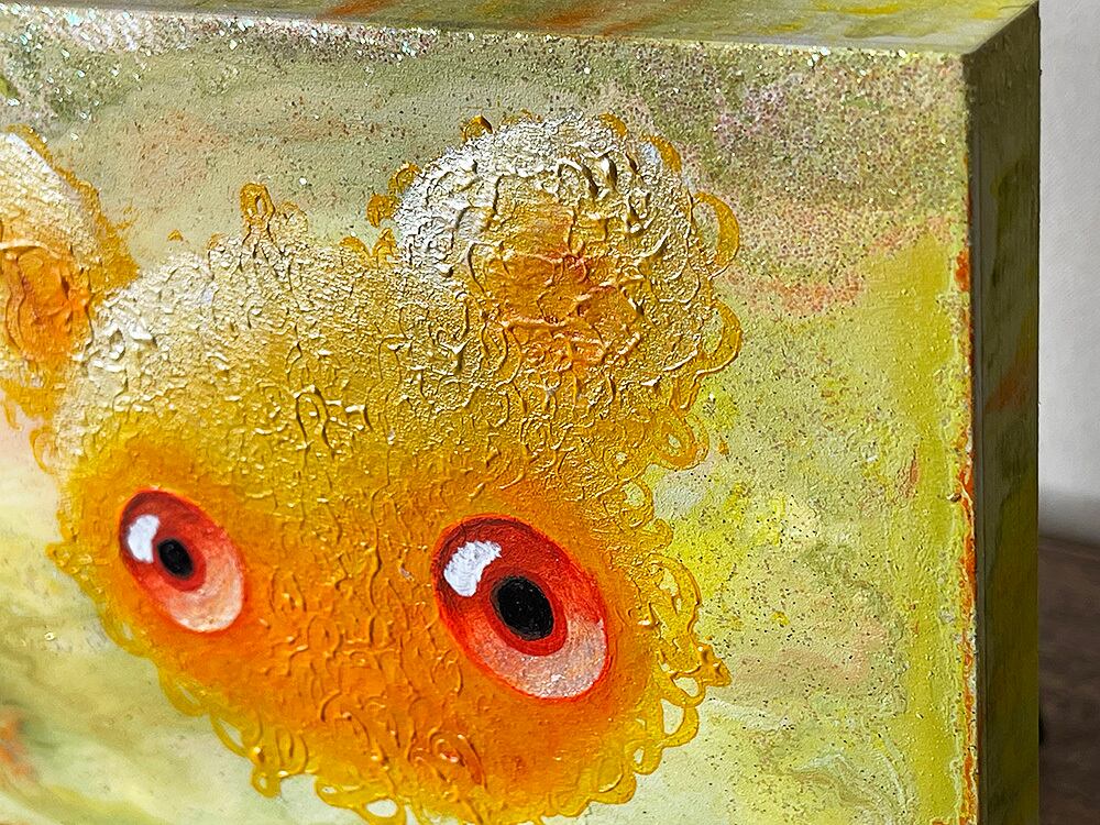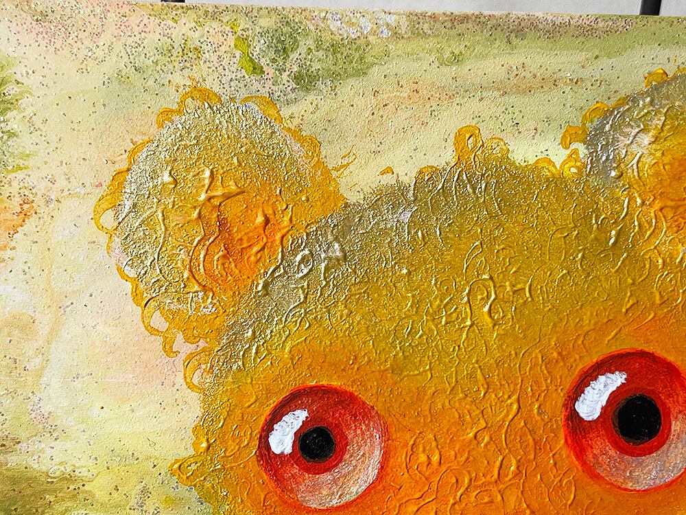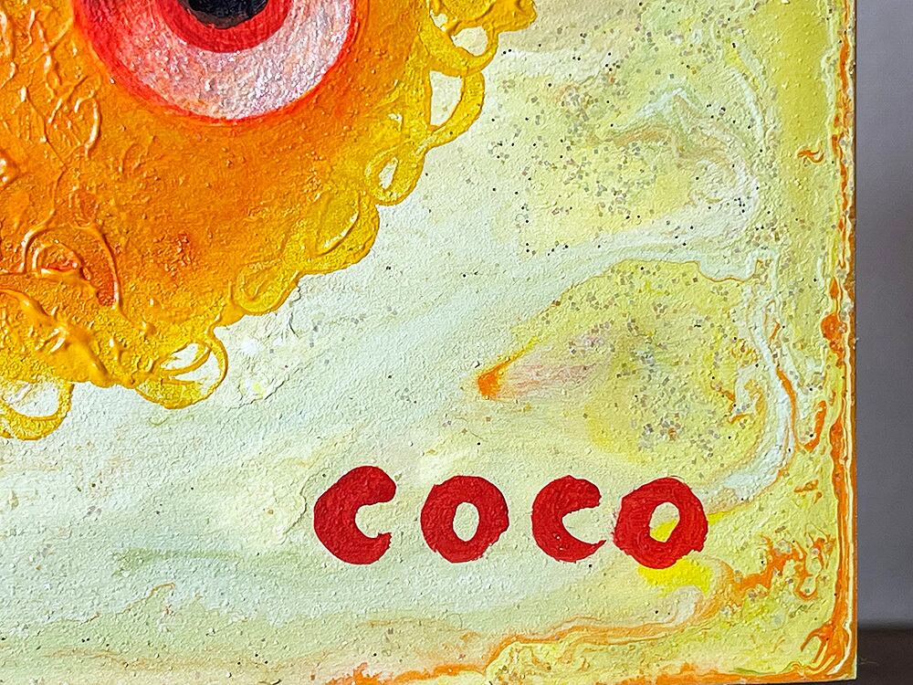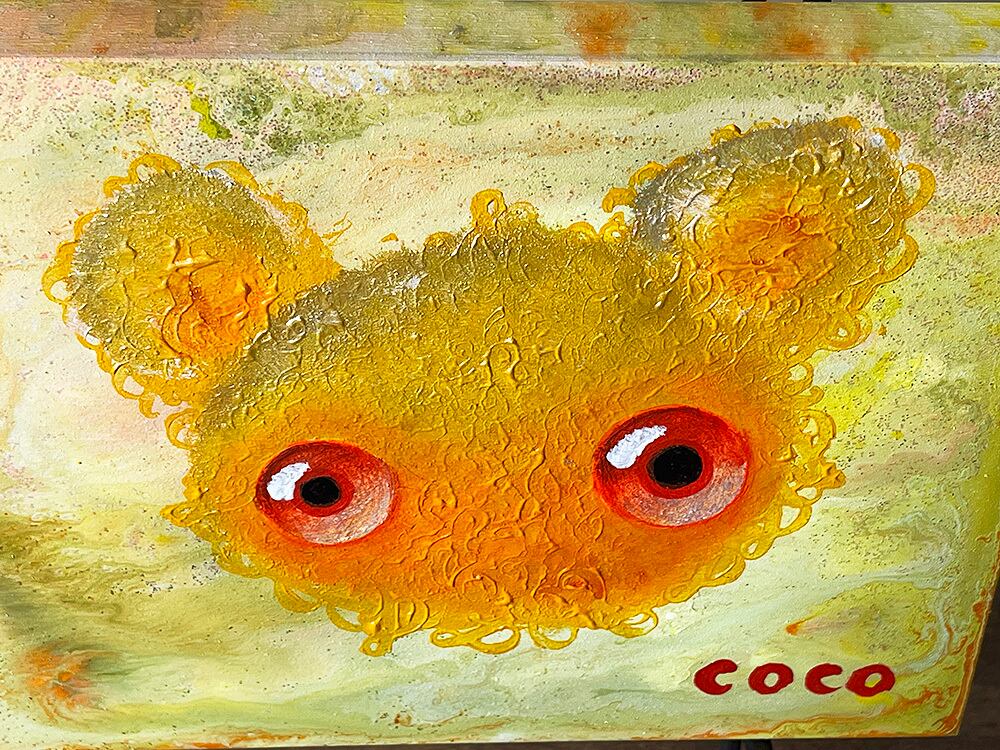 カラフルなポーリングの上に、独特な瞳を持つcocoオリジナルのぬいぐるみをポートレートとして描いた作品です。