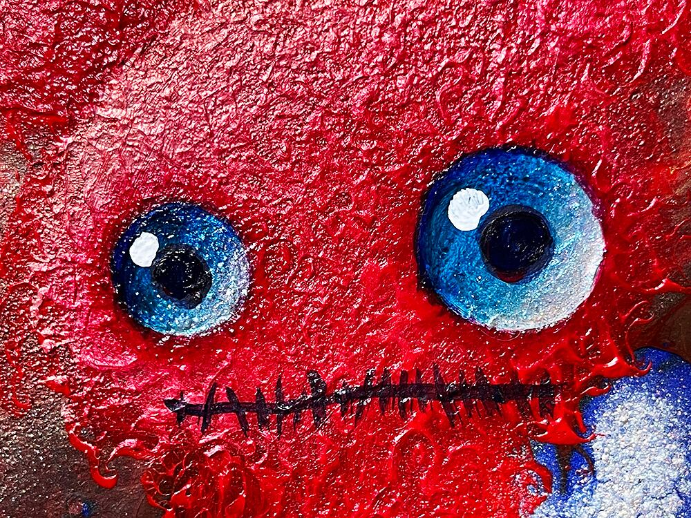 カラフルなポーリングの上に、独特な瞳を持つcocoオリジナルのぬいぐるみをポートレートとして描いた作品です。
