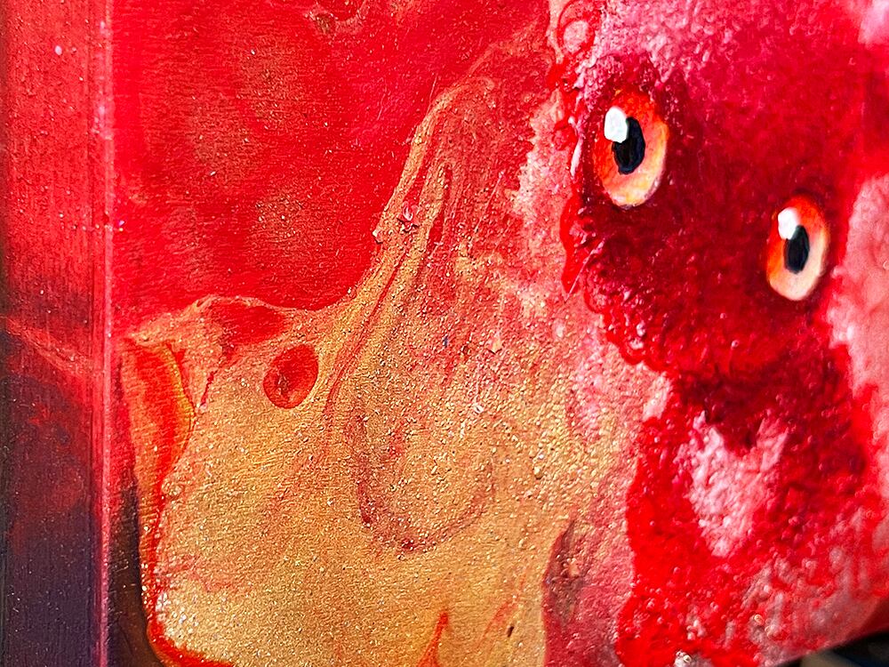 カラフルなポーリングの上に、独特な瞳を持つcocoオリジナルのぬいぐるみをポートレートとして描いた作品です。
