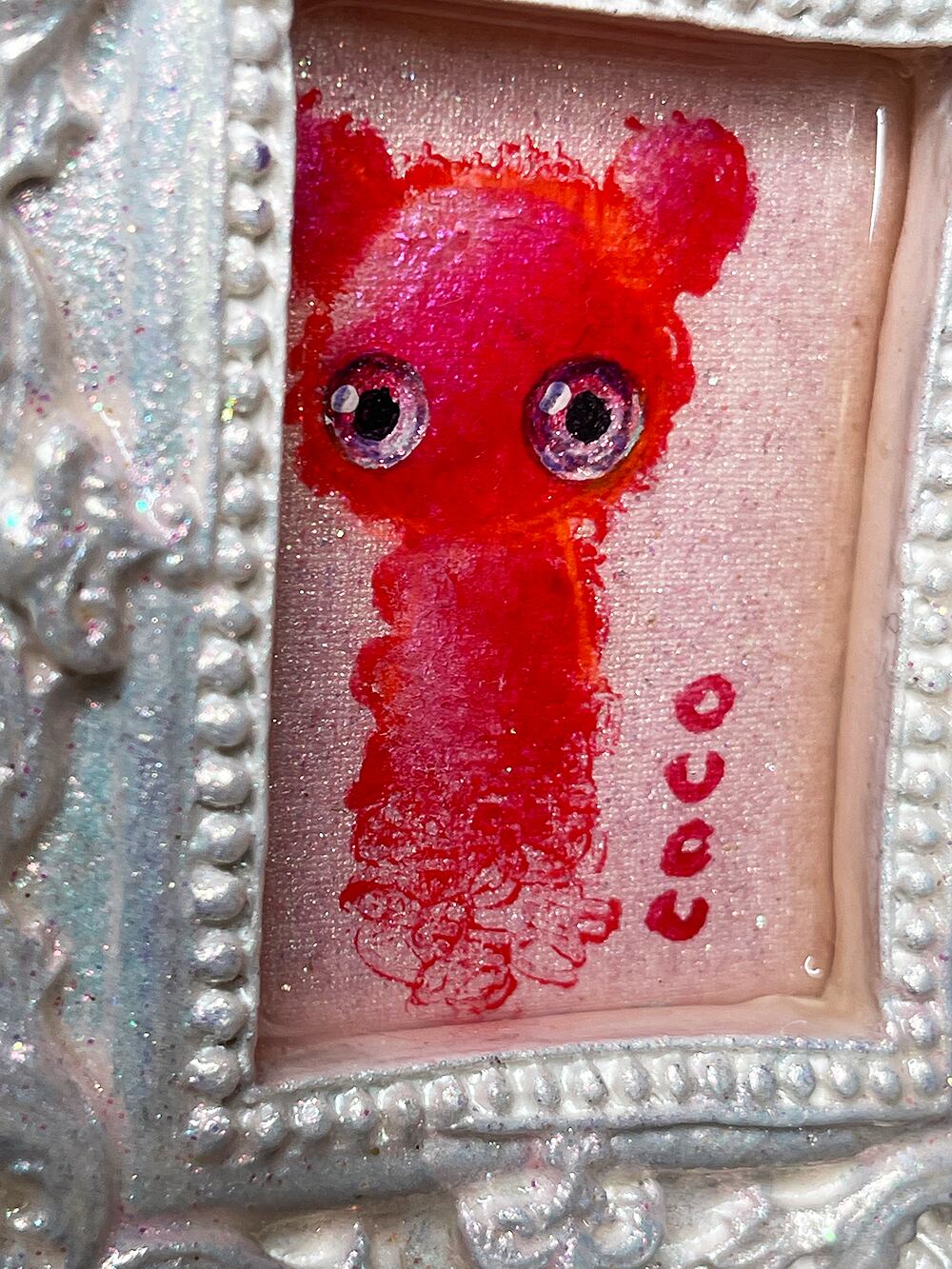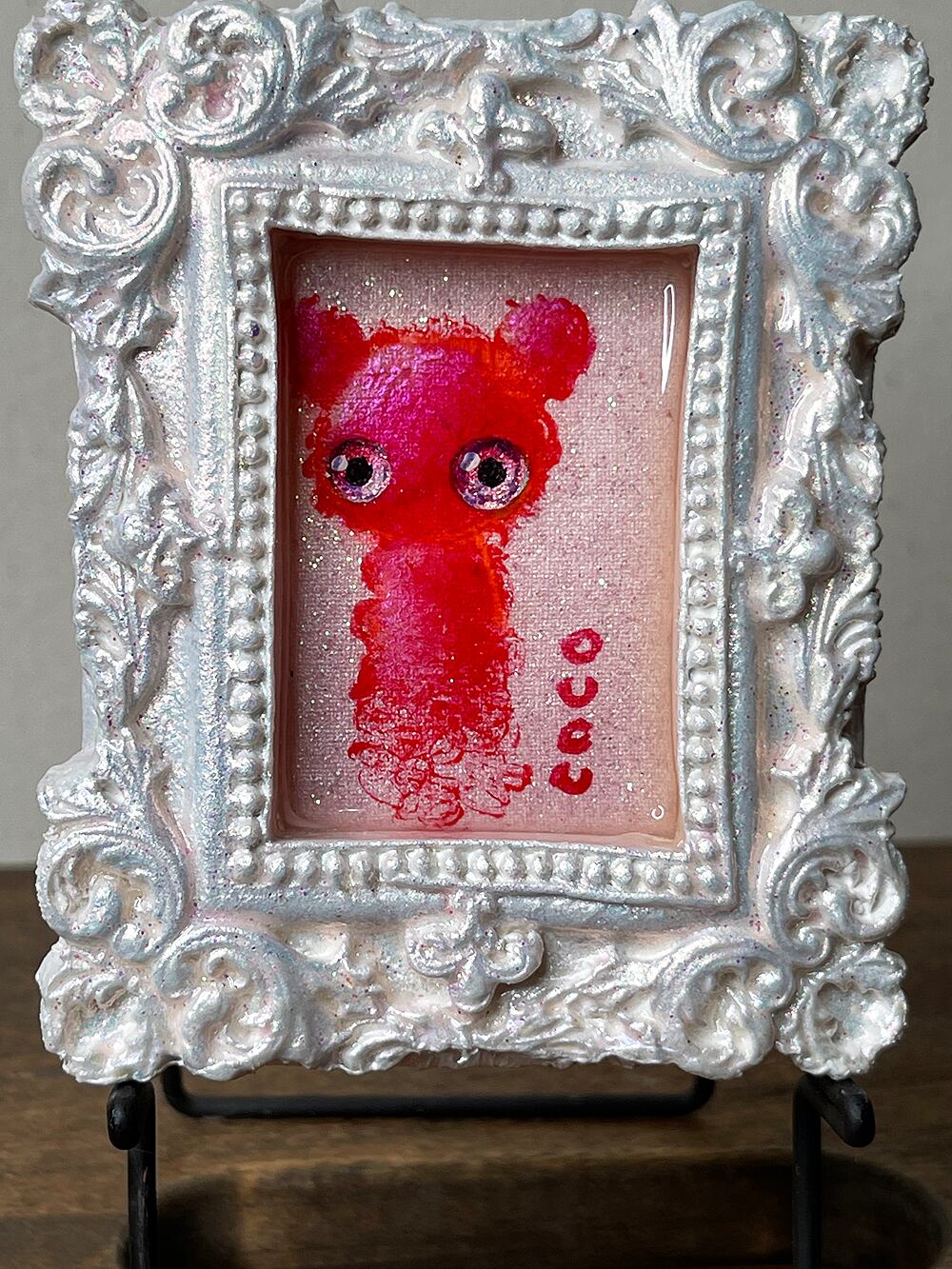 ミニチュアキャンバスにcocoくまを描き、石粉粘土でアンティーク風の額を作り、合体させた印籠サイズのミニチュア作品です。作品タイトルは生ライブに参加された視聴者様から公募して付けています。