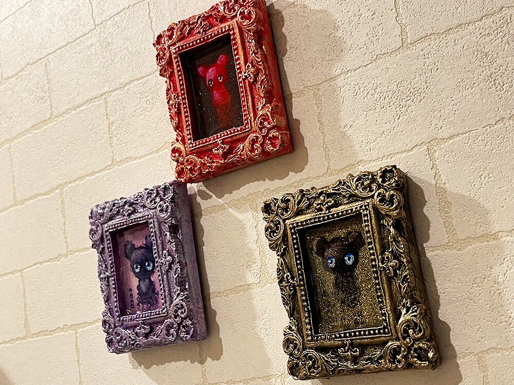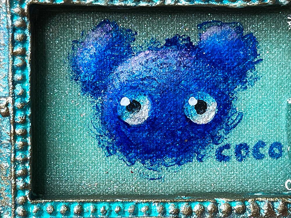 ミニチュアキャンバスにcocoくまを描き、石粉粘土でアンティーク風の額を作り、合体させた印籠サイズのミニチュア作品です。作品タイトルは生ライブに参加された視聴者様から公募して付けています。