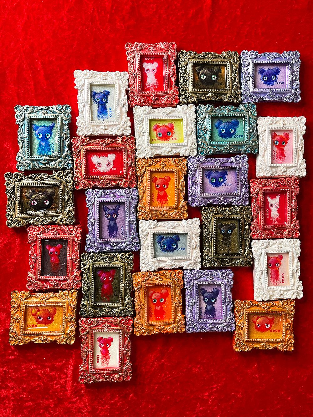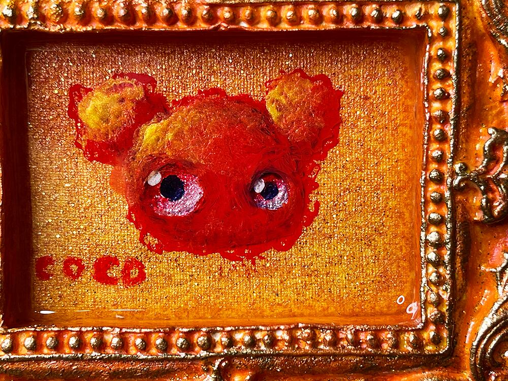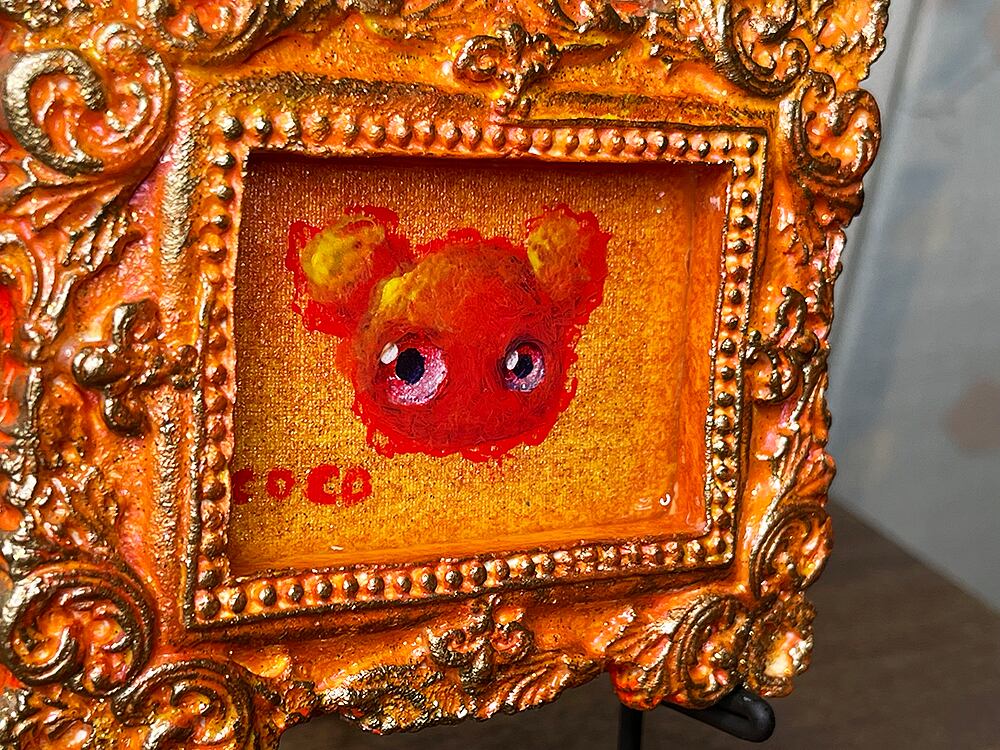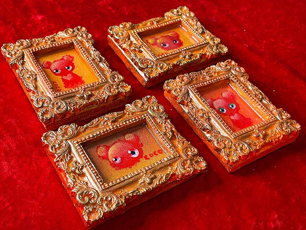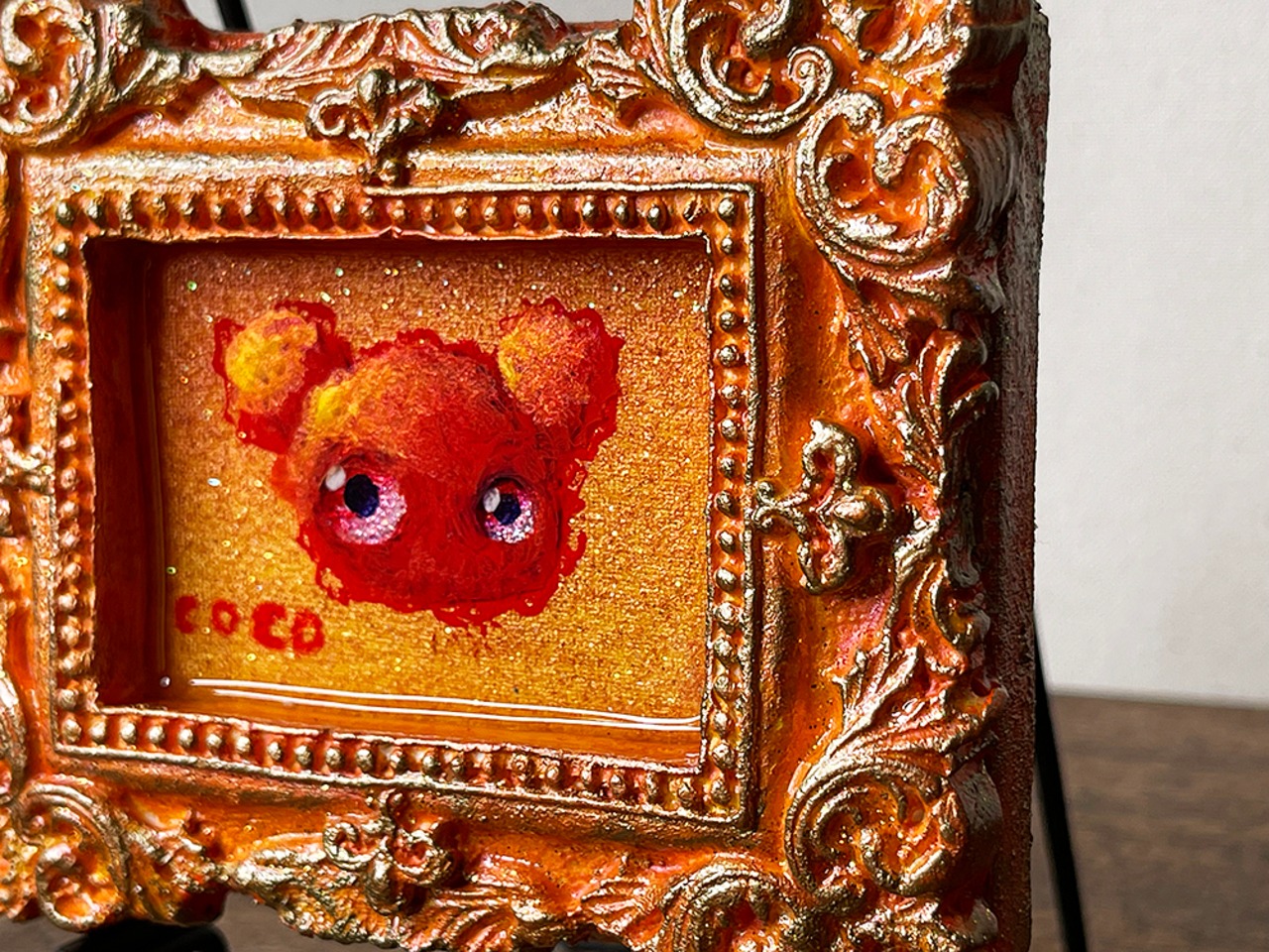 ミニチュアキャンバスにcocoくまを描き、石粉粘土でアンティーク風の額を作り、合体させた印籠サイズのミニチュア作品です。作品タイトルは生ライブに参加された視聴者様から公募して付けています。