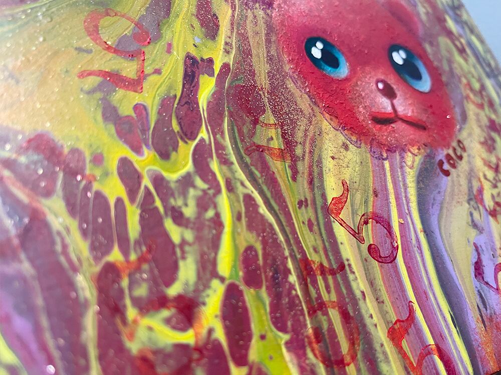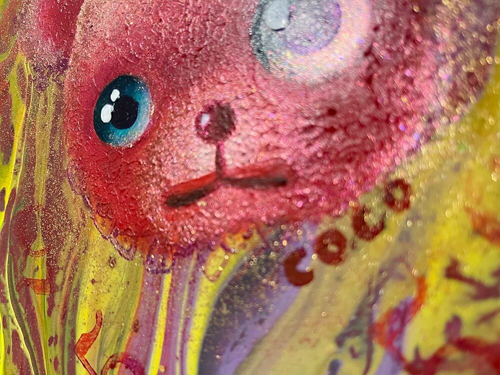 カラフルなポーリング技法を使って、ウッドパネルに描かれたアート作品「みつけた」です。赤いcocoくまが愛らしく絵が描かれています。この作品は、アクリル絵の具を用いて表現力と鮮やかさで、見る人の心を奪います。色彩の美しさと絵のディテールにもこだわっています。絵の具が流れる瞬間の美しさや、ポーリングの独特な模様が作り出す幻想的な世界観をお楽しみください。