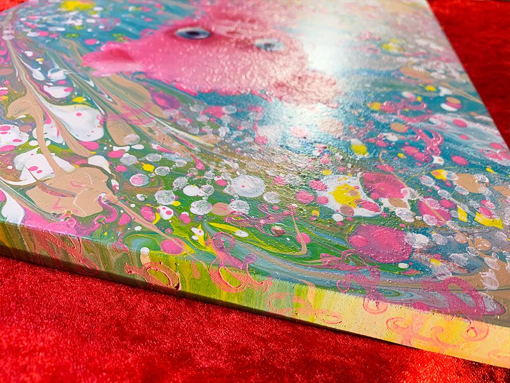 ウッドパネルにアクリル絵の具で丁寧に描かれたcocoくまは、ピンクやブルーをベースとしたカラフルなポーリング技法が施されており、そこにピンクのcocoくまが、まるで絵本の中から飛び出してきたかのような存在感で、あなたの日常を彩ります。心を込めて丁寧に描かれたcocoくまの表情や色彩は、見る人の心を癒してくれることでしょう。