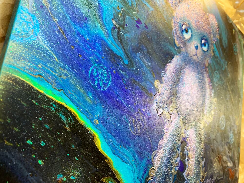 この作品は、まるで新たな世界へ誘ってくれるような神秘的な背景が特徴です。ウッドパネルの風合いと輝く色彩のコントラストが、空間を一層魅力的に演出します。部屋に飾っておくだけで、目を引く存在になること間違いありません。