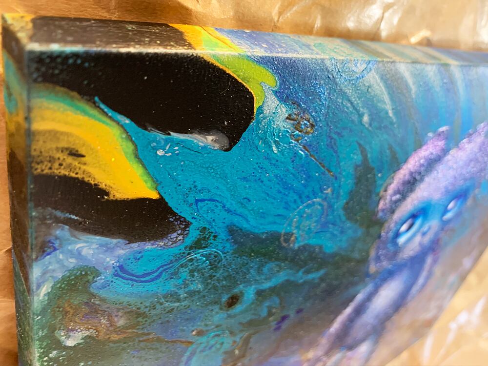 This work features a mysterious background that seems to invite you into a new world. The contrast between the texture of the wood panel and the shining colors makes the space even more attractive. Just by displaying it in a room, it is sure to become an eye-catching presence.