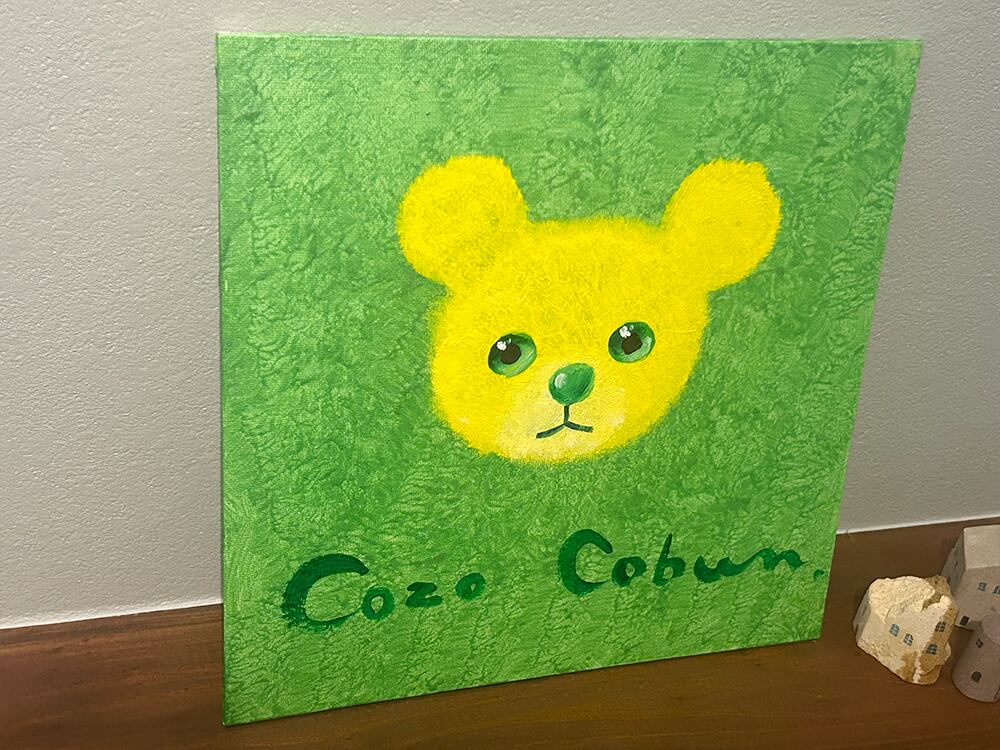 濃い黄緑の筆で模様を付けながら描かれたベースの上に緑の瞳の黄色い「cocoくま」が描かれています。