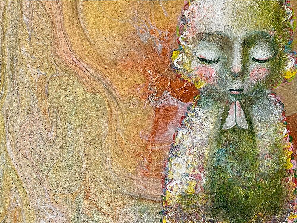 緑や金色、サーモンピンクなどが美しく混ざり合ったポーリングの土台の上に、自然の恵みである藻に包まれたお地蔵さんが手を合わせています。神秘的でかわいらしい雰囲気が魅力の作品です。coco自身初となるお地蔵さんに挑戦しながらも心を込めて作り上げました。