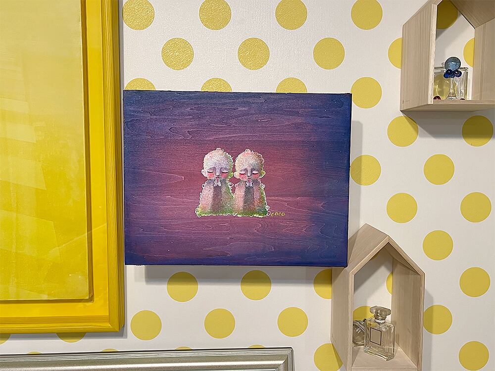 木製パネルをアクリル絵具で染め込む様に透明色を重ね、木目が浮き出た背景に二体の地蔵菩薩が寄り添う様に佇んでいます。今回の作品は、手にお数珠を持たせてあるのが特徴となっています。こちらの作品は生ライブ配信にて視聴者の皆様のコメントを反映させ心を込めて仕上げた作品となりました。