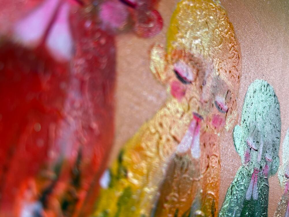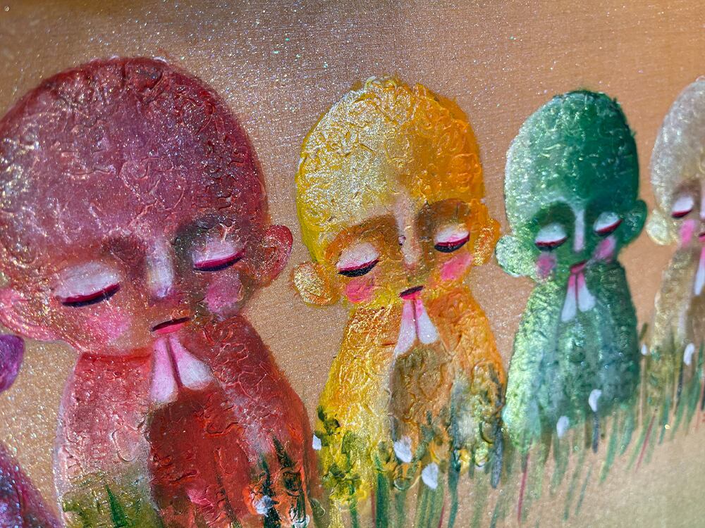 木製パネルにアクリル絵具でグラデーションの背景を作り、その上にひらがなのスタンプで八体の地蔵菩薩を描きました。まるでLGBTレインボーカラーの様ですが、生ライブ配信で視聴者の皆様から言葉、色等をリクエストにお答えしながら仕上げた作品です。螺鈿系、パール系等玉虫色や偏光色の絵の具を贅沢に使用しているため、角度によってはお地蔵さんの色が変化します。